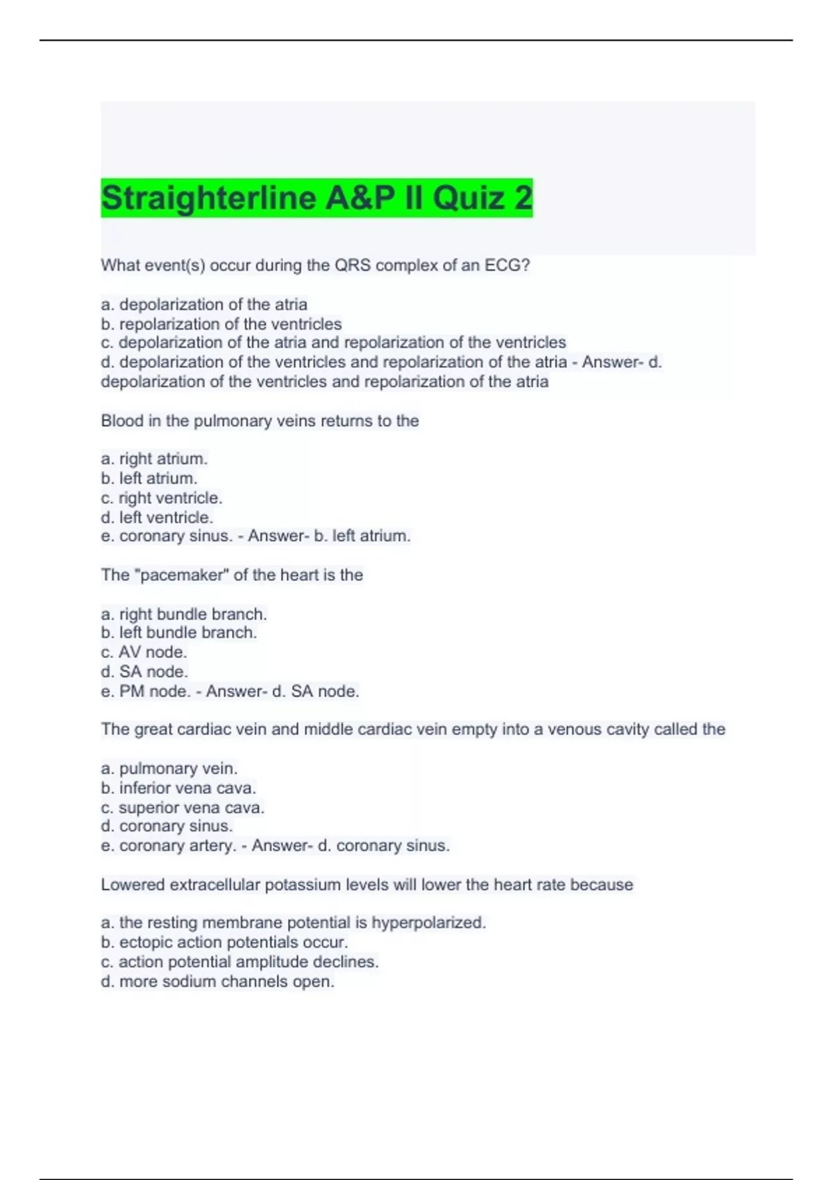 Straighterline A&P II Quiz 2 with complete solutions