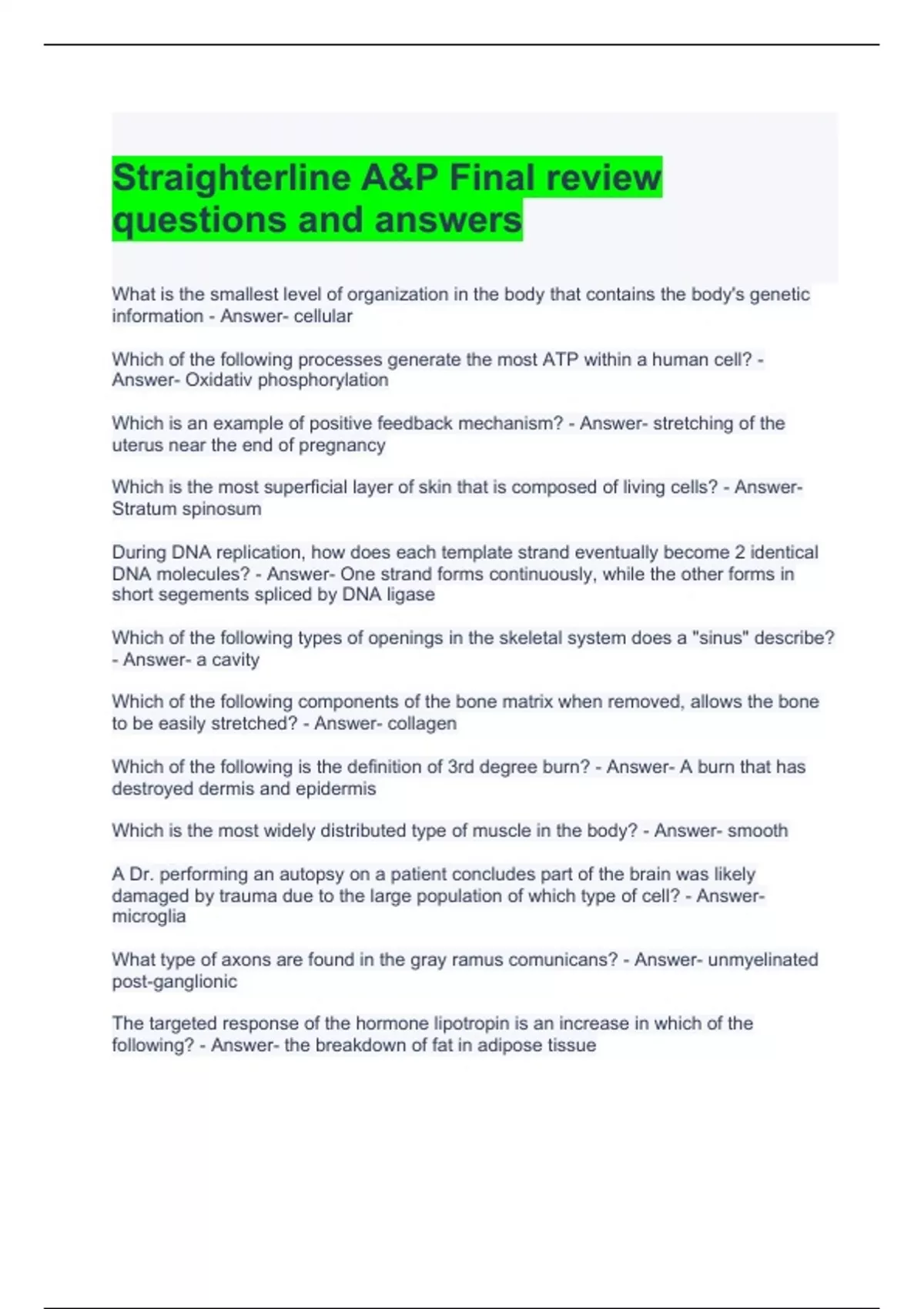 Straighterline A&P Final review questions and answers
