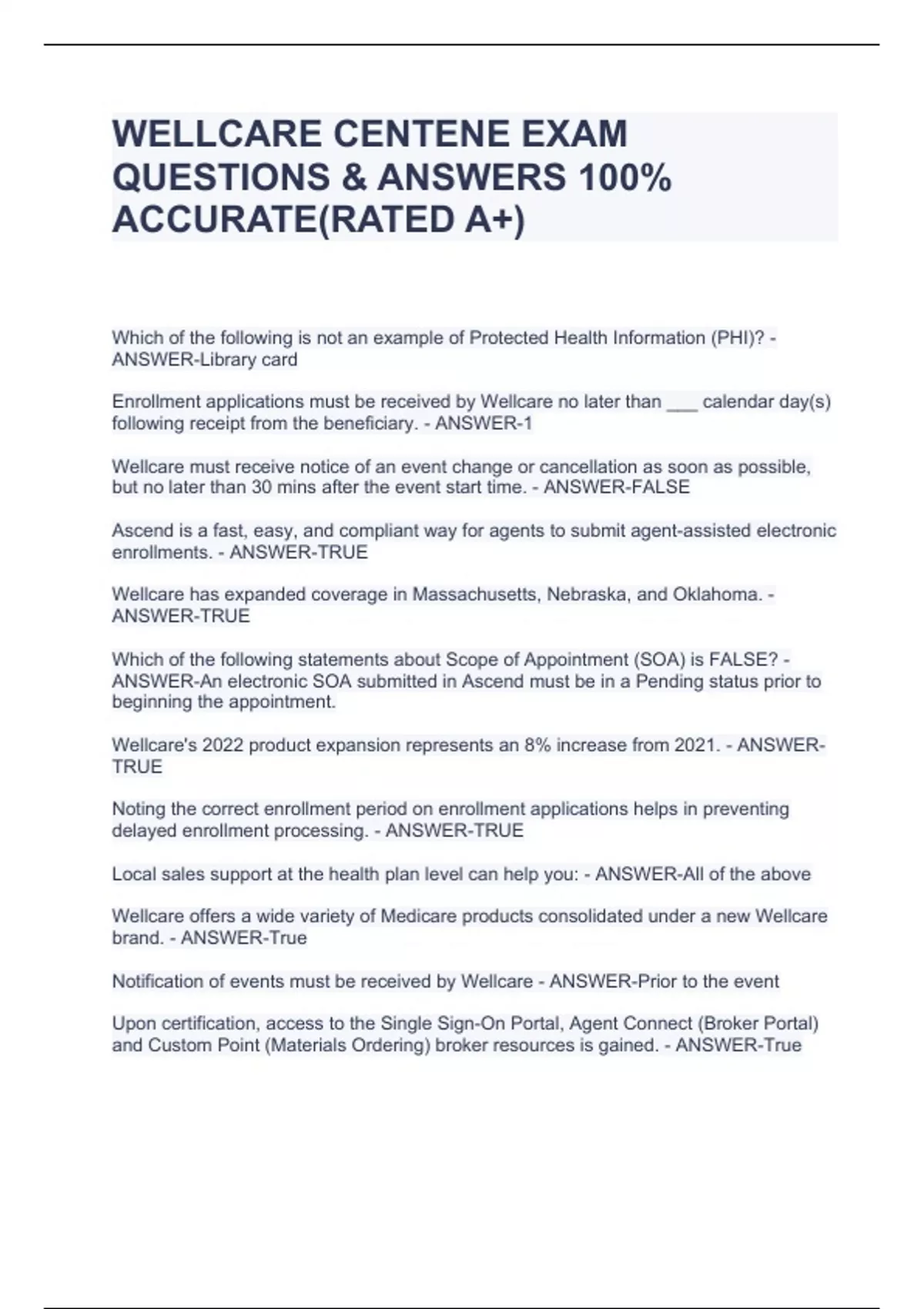 Which of the following is not an example of Protected Health Information (PHI)? - ANSWER-Library card Enrollment applications must be received by Wellcare no later than ___ calendar day(s) following receipt from the beneficiary. - ANSWER-1 Wellcare must receive notice of an event change or cancellation as soon as possible, but no later than 30 mins after the event start time. - ANSWER-FALSE Ascend is a fast, easy, and compliant way for agents to submit agent-assisted electronic enrollments. - ANSWER-TRUE Wellcare has expanded coverage in Massachusetts, Nebraska, and Oklahoma. - ANSWER-TRUE Which of the following statements about Scope of Appointment (SOA) is FALSE? - ANSWER-An electronic SOA submitted in Ascend must be in a Pending status prior to beginning the appointment. Wellcare's 2022 product expansion represents an 8% increase from 2021. - ANSWER-TRUE Noting the correct enrollment period on enrollment applications helps in preventing delayed enrollment processing. - ANSWER-TRUE Local sales support at the health plan level can help you: - ANSWER-All of the above Wellcare offers a wide variety of Medicare products consolidated under a new Wellcare brand. - ANSWER-True Notification of events must be received by Wellcare - ANSWER-Prior to the event Upon certification, access to the Single Sign-On Portal, Agent Connect (Broker Portal) and Custom Point (Materials Ordering) broker resources is gained. - ANSWER-True Wellcare has streamlined standalone PDP offerings from six plans to ___ in all 34 regions across all 50 states and D.C. - ANSWER-Three plans Health Risk Assessments: - ANSWER-All of the above The Part D Senior Savings Model (SSM), which reduces member spending on insulin, will be offered on the Value Script and Value Plus products. - ANSWER-True An agent may be terminated for cause if they fail to comply with a compliance investigation, encourage others to avoid the compliance interview process, or fail to provide truthful or complete information. - ANSWER-True A grievance request, or any evidence concerning a grievance, must be filed orally or in writing no later than _____ calendar days from the date of the event or the date the member is made aware of the issue. - ANSWER-60
