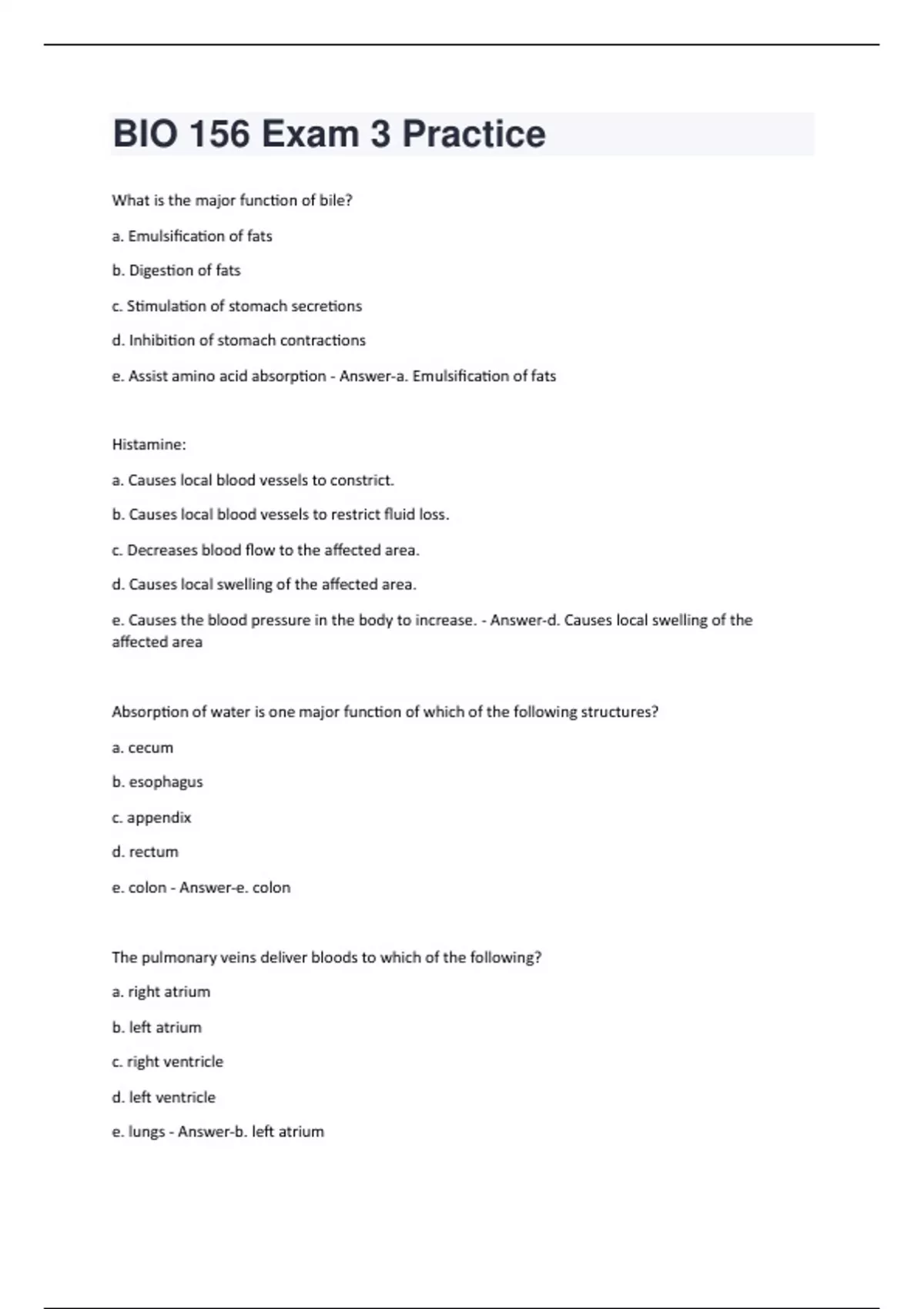 What is the major function of bile? a. Emulsification of fats b. Digestion of fats c. Stimulation of stomach secretions d. Inhibition of stomach contractions e. Assist amino acid absorption - Answer-a. Emulsification of fats Histamine: a. Causes local blood vessels to constrict. b. Causes local blood vessels to restrict fluid loss. c. Decreases blood flow to the affected area. d. Causes local swelling of the affected area. e. Causes the blood pressure in the body to increase. - Answer-d. Causes local swelling of the affected area Absorption of water is one major function of which of the following structures? a. cecum b. esophagus c. appendix d. rectum e. colon - Answer-e. colon The pulmonary veins deliver bloods to which of the following? a. right atrium b. left atrium c. right ventricle d. left ventricle e. lungs - Answer-b. left atriumWhat happens to nutrient macromolecules in your digestive tract? a. They are absorbed whole and are broken down to monomers in the cells that ultimately use them. b. The digestive breakdown of macromolecules is keyed to the body's need for monomers; only the monomers that are immediately needed are produced. c. Nucleic acids and triglycerides (which diffuse across the plasma membrane) are not digested to monomers; other macromolecules are. d. Proteins and nucleic acids are digested to monomers before absorption; energy-storage macromolecules (starched and fat) are absorbed whole. e. All nutrient macromolecules are digested to monomers before absorption. - Answer-e. All nutrient macromolecules are digested to monomers before absorption. The alimentary canal is best defined as which of the following? a. The compartment in which an animal digest its food. b. A tube-shaped digestive compartment with either one or two openings. c. A tube-like digestive compartment that has two openings and consists, at least a mouth, stomach, and intestine. d. A digestive cavity in which food is churned and mixed. e. A tube-shaped digestive compartment that has two openings and through which food moves in one direction. - Answer-b. A tube-shaped digestive compartment with either one or two openings.