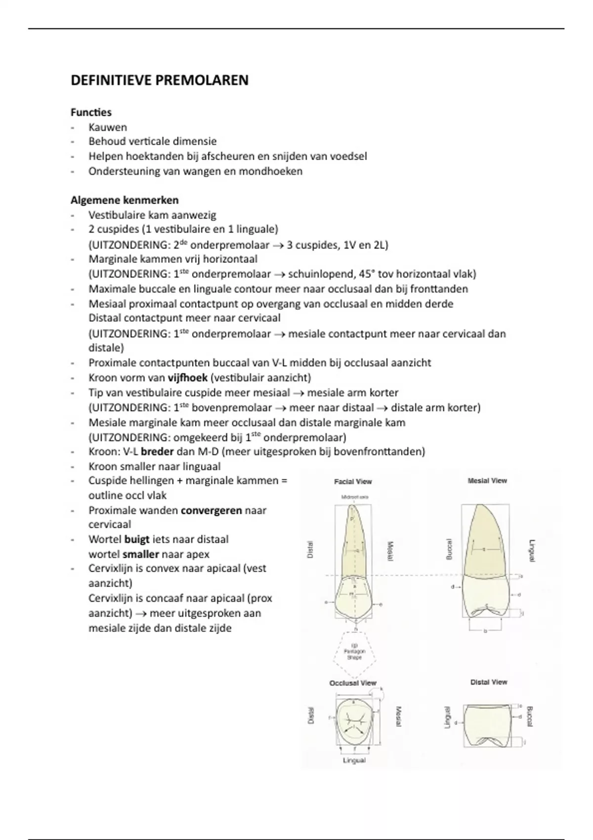 Overzichtelijke samenvatting DEFINITIEVE PREMOLAREN - Morfologie der Tanden