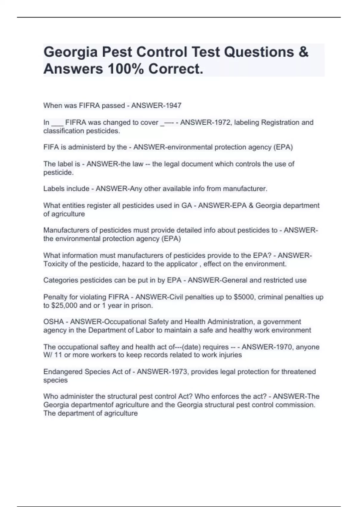 When was FIFRA passed - ANSWER-1947 In ___ FIFRA was changed to cover _—- - ANSWER-1972, labeling Registration and classification pesticides. FIFA is administerd by the - ANSWER-environmental protection agency (EPA) The label is - ANSWER-the law -- the legal document which controls the use of pesticide. Labels include - ANSWER-Any other available info from manufacturer. What entities register all pesticides used in GA - ANSWER-EPA & Georgia department of agriculture Manufacturers of pesticides must provide detailed info about pesticides to - ANSWER-the environmental protection agency (EPA) What information must manufacturers of pesticides provide to the EPA? - ANSWER-Toxicity of the pesticide, hazard to the applicator , effect on the environment. Categories pesticides can be put in by EPA - ANSWER-General and restricted use Penalty for violating FIFRA - ANSWER-Civil penalties up to $5000, criminal penalties up to $25,000 and or 1 year in prison. OSHA - ANSWER-Occupational Safety and Health Administration, a government agency in the Department of Labor to maintain a safe and healthy work environment The occupational saftey and health act of---(date) requires -- - ANSWER-1970, anyone W/ 11 or more workers to keep records related to work injuries
