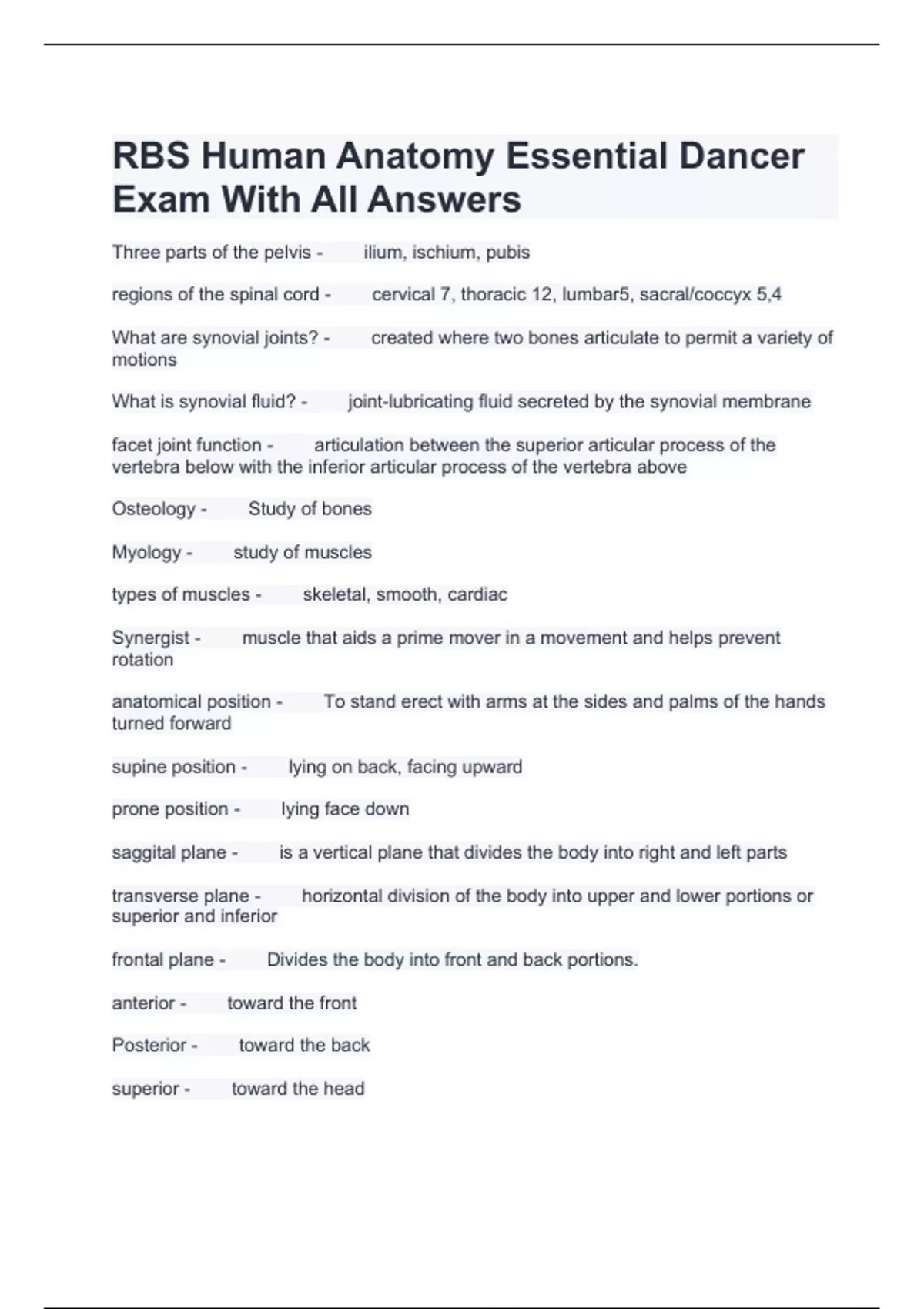 RBS Human Anatomy Essential Dancer Exam With All Answers