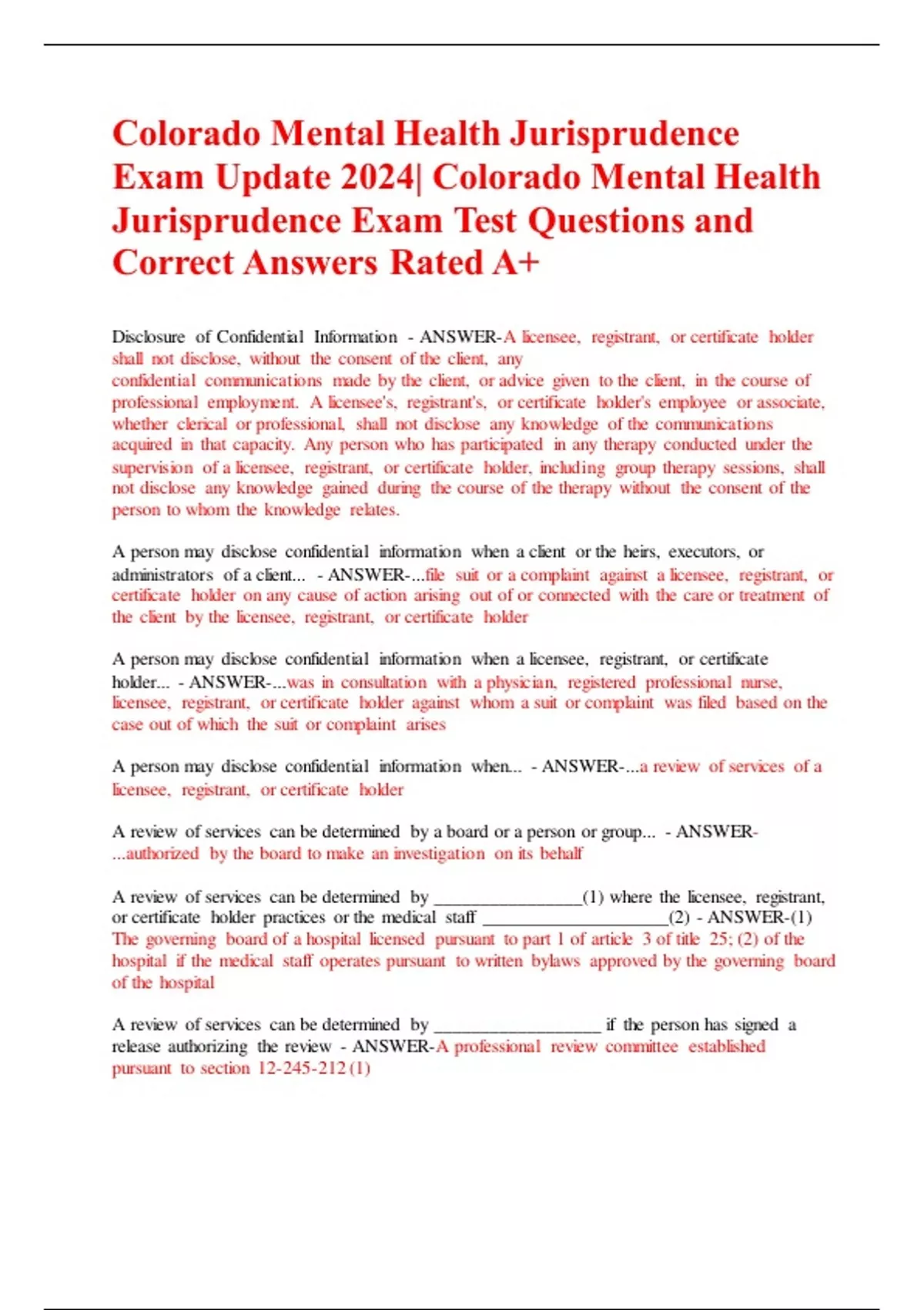 Colorado Mental Health Jurisprudence Exam Update 2024| Colorado Mental Health Jurisprudence Exam Test Questions and Correct Answers Rated A+