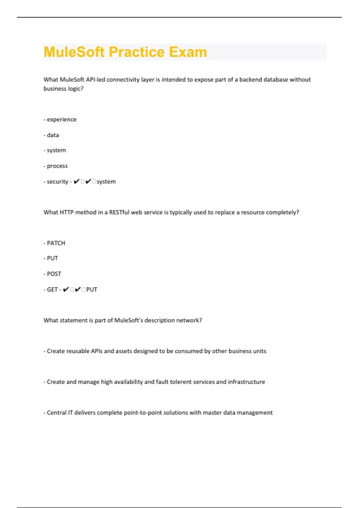 What MuleSoft API-led connectivity layer is intended to expose part of a backend database without business logic? - experience - data - system - process - security - ️️system What HTTP method in a RESTful web service is typically used to replace a resource completely? - PATCH - PUT - POST - GET - ️️PUT What statement is part of MuleSoft's description network? - Create reusable APIs and assets designed to be consumed by other business units - Create and manage high availability and fault tolerent services and infrastructure - Central IT delivers complete point-to-point solutions with master data management
