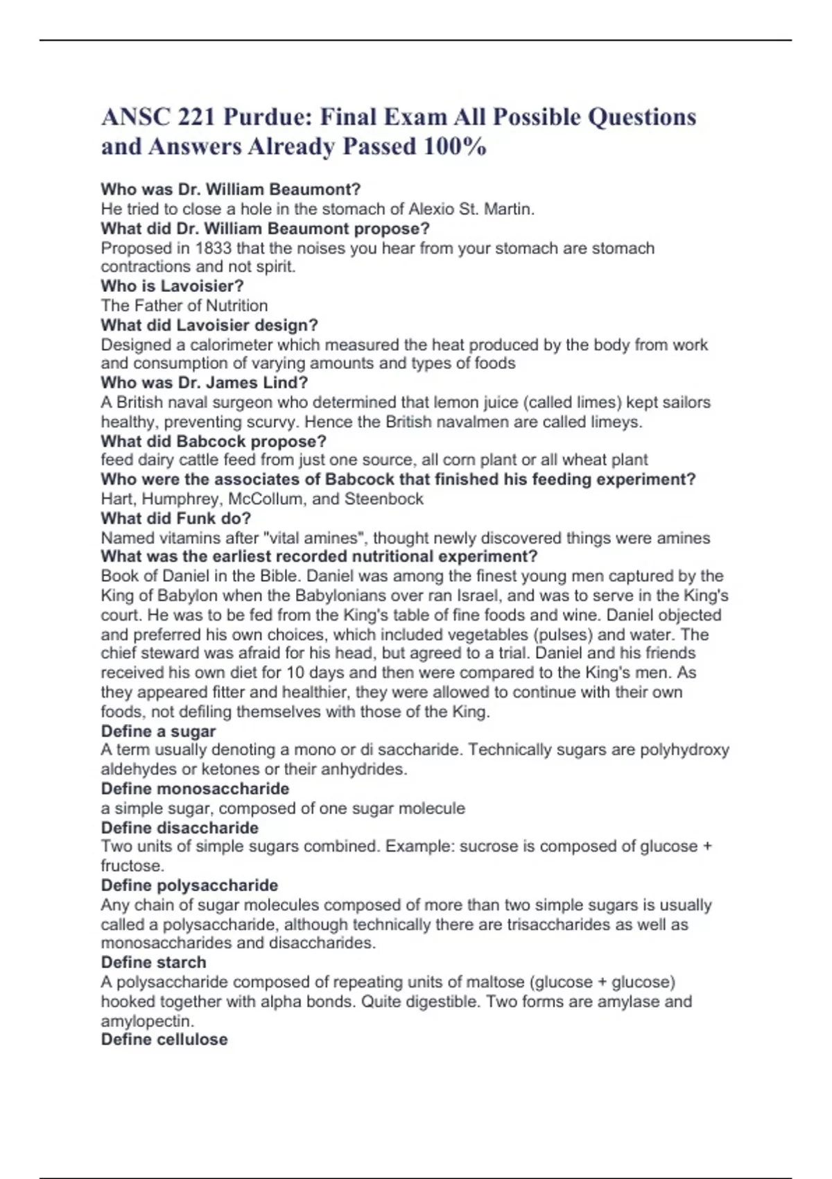 ANSC 221 Purdue: Final Exam All Possible Questions and Answers Already Passed 100% Who was Dr. William Beaumont? He tried to close a hole in the stomach of Alexio St. Martin. What did Dr. William Beaumont propose? Proposed in 1833 that the noises you hear from your stomach are stomach contractions and not spirit. Who is Lavoisier? The Father of Nutrition What did Lavoisier design? Designed a calorimeter which measured the heat produced by the body from work and consumption of varying amounts and types of foods Who was Dr. James Lind? A British naval surgeon who determined that lemon juice (called limes) kept sailors healthy, preventing scurvy. Hence the British navalmen are called limeys. What did Babcock propose? feed dairy cattle feed from just one source, all corn plant or all wheat plant Who were the associates of Babcock that finished his feeding experiment? Hart, Humphrey, McCollum, and Steenbock What did Funk do? Named vitamins after "vital amines", thought newly discovered things were amines What was the earliest recorded nutritional experiment? Book of Daniel in the Bible. Daniel was among the finest young men captured by the King of Babylon when the Babylonians over ran Israel, and was to serve in the King's court. He was to be fed from the King's table of fine foods and wine. Daniel objected and preferred his own choices, which included vegetables (pulses) and water. The chief steward was afraid for his head, but agreed to a trial. Daniel and his friends received his own diet for 10 days and then were compared to the King's men. As they appeared fitter and healthier, they were allowed to continue with their own foods, not defiling themselves with those of the King. Define a sugar A term usually denoting a mono or di saccharide. Technically sugars are polyhydroxy aldehydes or ketones or their anhydrides. Define monosaccharide a simple sugar, composed of one sugar molecule Define disaccharide Two units of simple sugars combined. Example: sucrose is composed of glucose + fructose. Define polysaccharide Any chain of sugar molecules composed of more than two simple sugars is usually called a polysaccharide, although technically there are trisaccharides as well as monosaccharides and disaccharides. Define starch A polysaccharide composed of repeating units of maltose (glucose + glucose) hooked together with alpha bonds. Quite digestible. Two forms are amylase and amylopectin. Define cellulose