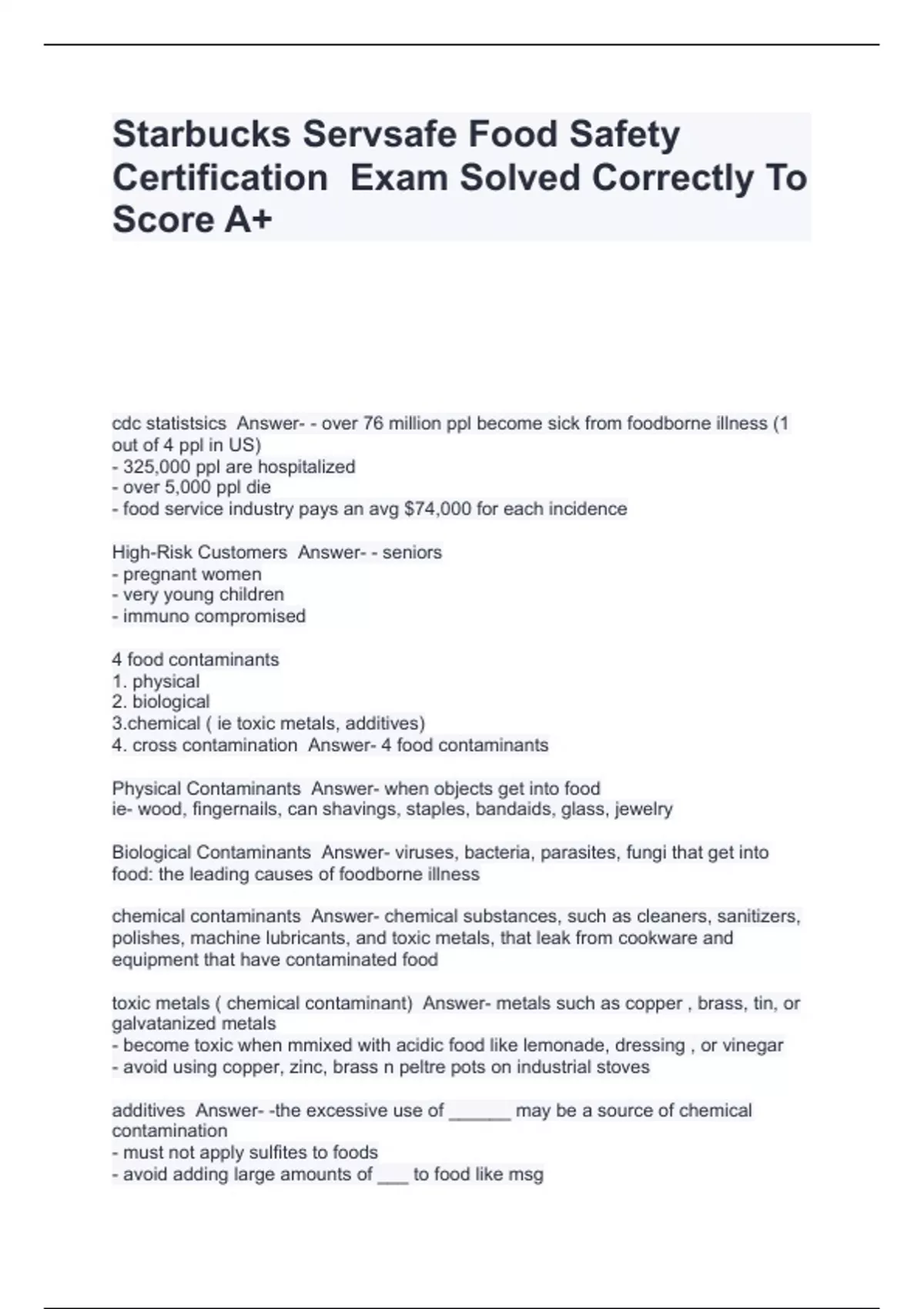 Starbucks Servsafe Food Safety Certification Exam Solved Correctly To Score A+