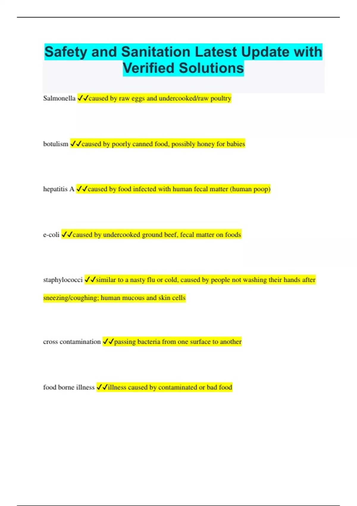 Safety and Sanitation Latest Update with Verified Solutions Salmonella caused by raw eggs and undercooked/raw poultry botulism caused by poorly canned food, possibly honey for babies hepatitis A caused by food infected with human fecal matter (human poop) e-coli caused by undercooked ground beef, fecal matter on foods staphylococci similar to a nasty flu or cold, caused by people not washing their hands after sneezing/coughing; human mucous and skin cells cross contamination passing bacteria from one surface to another food borne illness illness caused by contaminated or bad food NDVs nausea, diarrhea, vomiting; the common symptoms of most food borne illnesses danger zone the temperature range where bacteria can grow in foods; 41-135 degrees F 165 degrees F internal temperature for all poultry, leftovers and reheated foods 155 degrees F internal temperature for all ground meat (i.e. ground beef) 40 degrees F cold storage of foods must be 40 degrees or below 0 degrees F proper freezer temperature Sharp knives The most safe form of a knife because it uses less pressure 20 seconds time you should wash your hands with hot, soapy water Direct pressure When treating a cut, apply this to stop the bleeding treatment for a 1st/2nd degree burn Run under cool water or apply a cool, damp cloth How to put out a grease fire Metal lid, baking soda, turn off the heat, fire extinguisher, lots of salt 145 degrees F internal temperature for solid cuts of meat and seafood deadly gas mixing chlorine with any product containing ammonia will create this step stool tool used for reaching high objects lower shelves place to store heavy items common kitchen accidents cuts, spills and burns water never put this on a grease fire Spills clean these up immediately to avoid falls steam burns caused by hot vaporized water; open the lids away from you to avoid these dull knives the most dangerous type of knife washing hands the most effective prevention of food-borne illness when in doubt throw it out clostridium perfringens time/temperature abused foods campylobacter raw milk norovirus infected handler FATTOM conditions bacteria need to grow pathogens bad bacteria that cause food borne illness drinking glasses wash these first