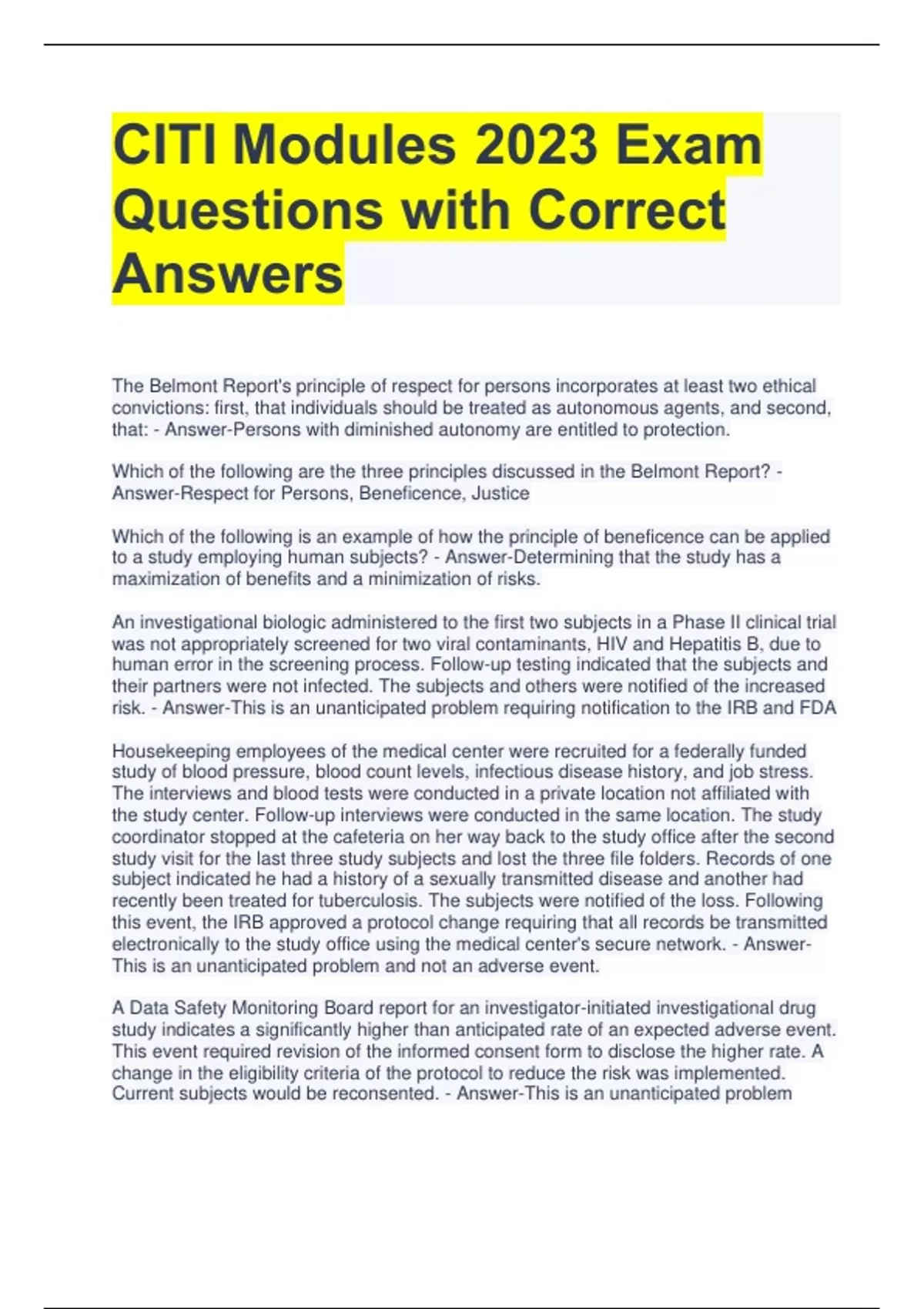 CITI Modules 2023 Exam Questions with Correct Answers The Belmont Report's principle of respect for persons incorporates at least two ethical convictions: first, that individuals should be treated as autonomous agents, and second, that: - Answer-Persons with diminished autonomy are entitled to protection. Which of the following are the three principles discussed in the Belmont Report? - Answer-Respect for Persons, Beneficence, Justice Which of the following is an example of how the principle of beneficence can be applied to a study employing human subjects? - Answer-Determining that the study has a maximization of benefits and a minimization of risks. An investigational biologic administered to the first two subjects in a Phase II clinical trial was not appropriately screened for two viral contaminants, HIV and Hepatitis B, due to human error in the screening process. Follow-up testing indicated that the subjects and their partners were not infected. The subjects and others were notified of the increased risk. - Answer-This is an unanticipated problem requiring notification to the IRB and FDA Housekeeping employees of the medical center were recruited for a federally funded study of blood pressure, blood count levels, infectious disease history, and job stress. The interviews and blood tests were conducted in a private location not affiliated with the study center. Follow-up interviews were conducted in the same location. The study coordinator stopped at the cafeteria on her way back to the study office after the second study visit for the last three study subjects and lost the three file folders. Records of one subject indicated he had a history of a sexually transmitted disease and another had recently been treated for tuberculosis. The subjects were notified of the loss. Following this event, the IRB approved a protocol change requiring that all records be transmitted electronically to the study office using the medical center's secure network. - AnswerThis is an unanticipated problem and not an adverse event. A Data Safety Monitoring Board report for an investigator-initiated investigational drug study indicates a significantly higher than anticipated rate of an expected adverse event. This event required revision of the informed consent form to disclose the higher rate. A change in the eligibility criteria of the protocol to reduce the risk was implemented. Current subjects would be reconsented. - Answer-This is an unanticipated problem