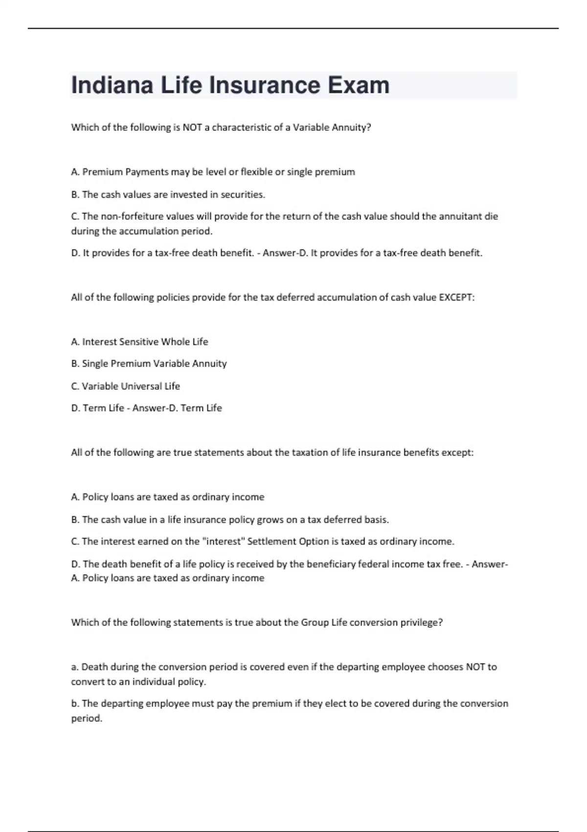 D. It provides for a tax-free death benefit. - Answer-D. It provides for a tax-free death benefit.