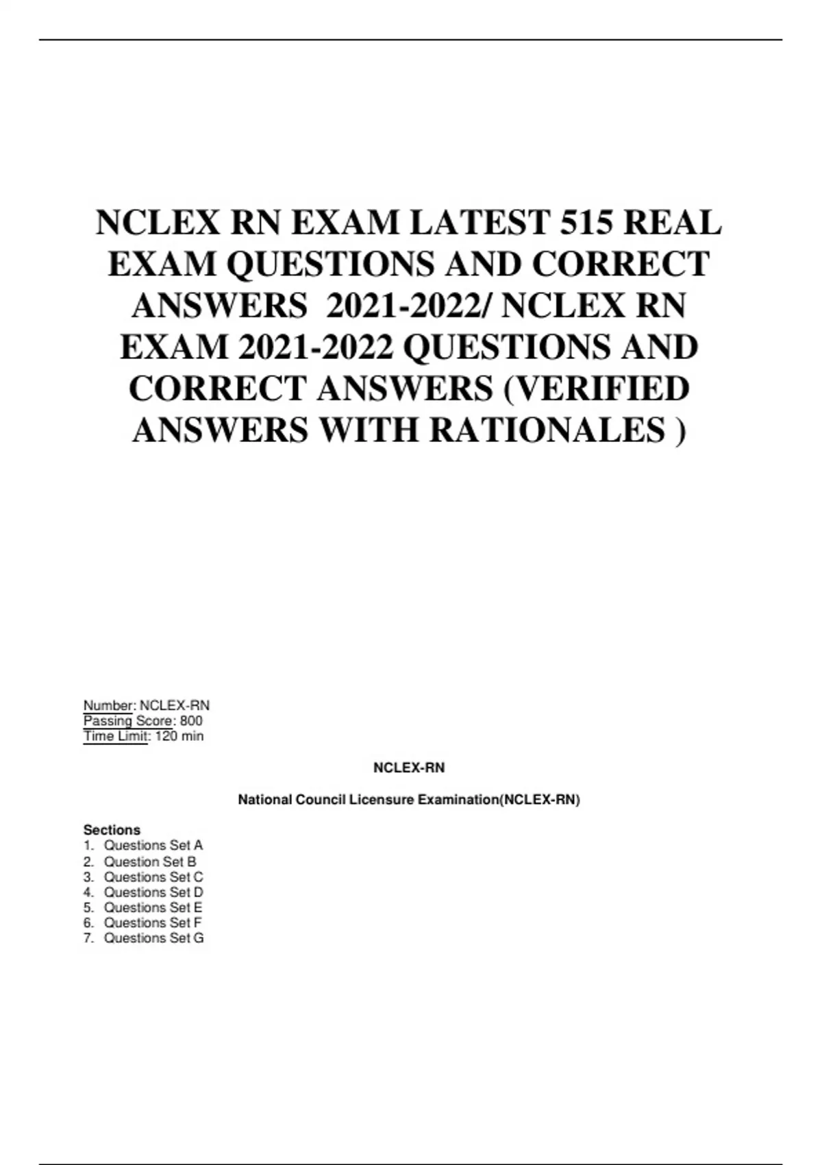 NCLEX RN EXAM LATEST 515 REAL EXAM QUESTIONS AND CORRECT ANSWERS / NCLEX RN EXAM QUESTIONS AND CORRECT ANSWERS (VERIFIED ANSWERS WITH RATIONALES ) Number: NCLEX-RN Passing Score: 800 Time Limit: 120 min NCLEX-RN National Council Licensure Examination(NCLEX-RN) Sections 1. Questions Set A 2. Question Set B 3. Questions Set C 4. Questions Set D 5. Questions Set E 6. Questions Set F 7. Questions Set G Exam A QUESTION 1 To appropriately monitor therapy and client progress, the nurse should be aware that increased myocardial work and O2 demand will occur with which of the following? A. Positive inotropic therapy B. Negative chronotropic therapy C. Increase in balance of myocardial O2 supply and demand D. Afterload reduction therapy Correct Answer: A Section: Questions Set A Explanation Explanation/Reference: Explanation: (A) Inotropic therapy will increase contractility, which will increase myocardial O2 demand. (B) Decreased heart rate to the point of bradycardia will increase coronary artery filling time. This should be used cautiously because tachycardia may be a compensatory mechanism to increase cardiac output. (C) The goal in the care of the MI client with angina is to maintain a balance between myocardial O2 supply and demand. (D) Decrease in systemic vascular resistance by drug therapy, such as IV nitroglycerin or nitroprusside, or intra-aortic balloon pump therapy, would decrease myocardial work and O2 demand. QUESTION 2 The nurse would need to monitor the serum glucose levels of a client receiving which of the following medications, owing to its effects on glycogenolysis and insulin release? A. Norepinephrine (Levophed) B. Dobutamine (Dobutrex) C. Propranolol (Inderal) D. Epinephrine (Adrenalin) Correct Answer: D Section: Questions Set A Explanation Explanation/Reference: Explanation: (A) Norepinephrine’s side effects are primarily related to safe, effective care environment and include decreased peripheral perfusion and bradycardia. (B) Dobutamine’s side effects include increased heart rate and blood pressure, ventricular ectopy, nausea, and headache. (C) Propranolol’s side effects include elevated blood urea nitrogen, serum transaminase, alkaline phosphatase, and lactic dehydrogenase. (D) Epinephrine increases serum glucose levels by increasing glycogenolysis and inhibiting insulin release. Prolonged use can elevate serum lactate levels, leading to metabolic acidosis, increased urinary catecholamines, false elevation of blood urea nitrogen, and decreased coagulation time. QUESTION 3 Which of the following medications requires close observation for bronchospasm in the client with chronic obstructive pulmonary disease or asthma? A. Verapamil (Isoptin) B. Amrinone (Inocor) C. Epinephrine (Adrenalin) D. Propranolol (Inderal) Correct Answer: D Section: Questions Set A Explanation Explanation/Reference: Explanation: (A) Verapamil has the respiratory side effect of nasal or chest congestion, dyspnea, shortness of breath (SOB), and wheezing. (B) Amrinone has the effect of increased contractility and dilation of the vascular smooth muscle. It has no noted respiratory side effects. (C) Epinephrine has the effect of bronchodilation through β stimulation. (D) Propranolol, esmolol, and labetalol are all β- blocking agents, which can increase airway resistance and cause bronchospasms. QUESTION 4 The following medications were noted on review of the client’s home medication profile. Which of the medications would most likely potentiate or elevate serum digoxin levels? A. KCl B. Thyroid agents C. Quinidine D. Theophylline Correct Answer: C Section: Questions Set A Explanation Explanation/Reference: Explanation: (A) Hypokalemia can cause digoxin toxicity. Administration of KCl would prevent this. (B) Thyroid agents decrease digoxin levels. (C) Quinidine increases digoxin levels dramatically. (D) Theophylline is not noted to have an effect on digoxin levels. QUESTION 5 In the client with a diagnosis of coronary artery disease, the nurse would anticipate the complication of bradycardia with occlusion of which coronary artery? A. Right coronary artery B. Left main coronary artery C. Circumflex coronary artery D. Left anterior descending coronary artery Correct Answer: A Section: Questions Set A Explanation Explanation/Reference: Explanation: (A) Sinus bradycardia and atrioventricular (AV) heart block are usually a result of right coronary artery occlusion. The right coronary artery perfuses the sinoatrial and AV nodes in mostindividuals. (B) Occlusion of the left main coronary artery causes bundle branch blocks and premature ventricular contractions. (C) Occlusion of the circumflex artery does not cause bradycardia. (D) Sinus tachycardia occurs primarily with left anterior descending coronary artery occlusion because this form of occlusion impairs left ventricular function. QUESTION 6 When inspecting a cardiovascular client, the nurse notes that he needs to sit upright to breathe. This behavior is most indicative of: A. Pericarditis B. Anxiety C. Congestive heart failure D. Angina Correct Answer: C Section: Questions Set A Explanation Explanation/Reference: Explanation: (A) Pericarditis can cause dyspnea but primarily causes chest pain. (B) Anxiety can cause dyspnea resulting in SOB, yet it is not typically influenced by degree of head elevation. (C) The inability to oxygenate well without being upright is most indicative of congestive heart failure, due to alveolar drowning. (D) Angina causes primarily chest pain; any SOB associated with angina is not influenced by body position. QUESTION 7 When a client questions the nurse as to the purpose of exercise electrocardiography (ECG) in the diagnosis of cardiovascular disorders, the nurse’s response should be based on the fact that: A. The test provides a baseline for further tests B. The procedure simulates usual daily activity and myocardial performance C. The client can be monitored while cardiac conditioning and heart toning are done D. I