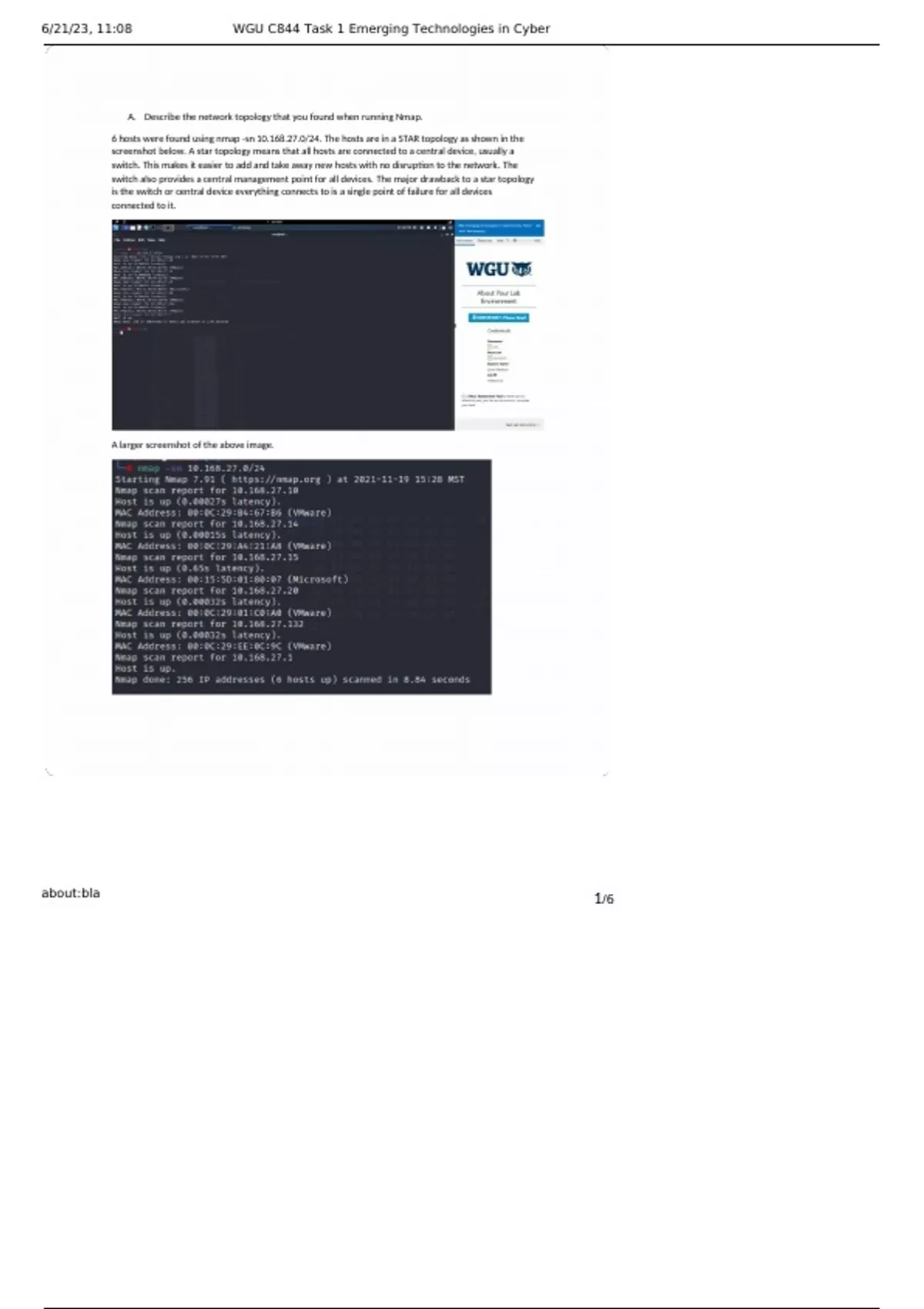 Wgu c844 task 1 emerging technologies in cyber security, Updated 2024 A. Describe the network topology that you found when running Nmap. 6 hosts were found using nmap -sn 10.168.27.0/24. The hosts are in a STAR topology as shown in the screenshot below. A star topology means that all hosts are connected to a central device, usually a switch. This makes it easier to add and take away new hosts with no disruption to the network. The switch also provides a central management point for all devices. The major drawback to a star topology is the switch or central device everything connects to is a single point of failure for all devices connected to it.