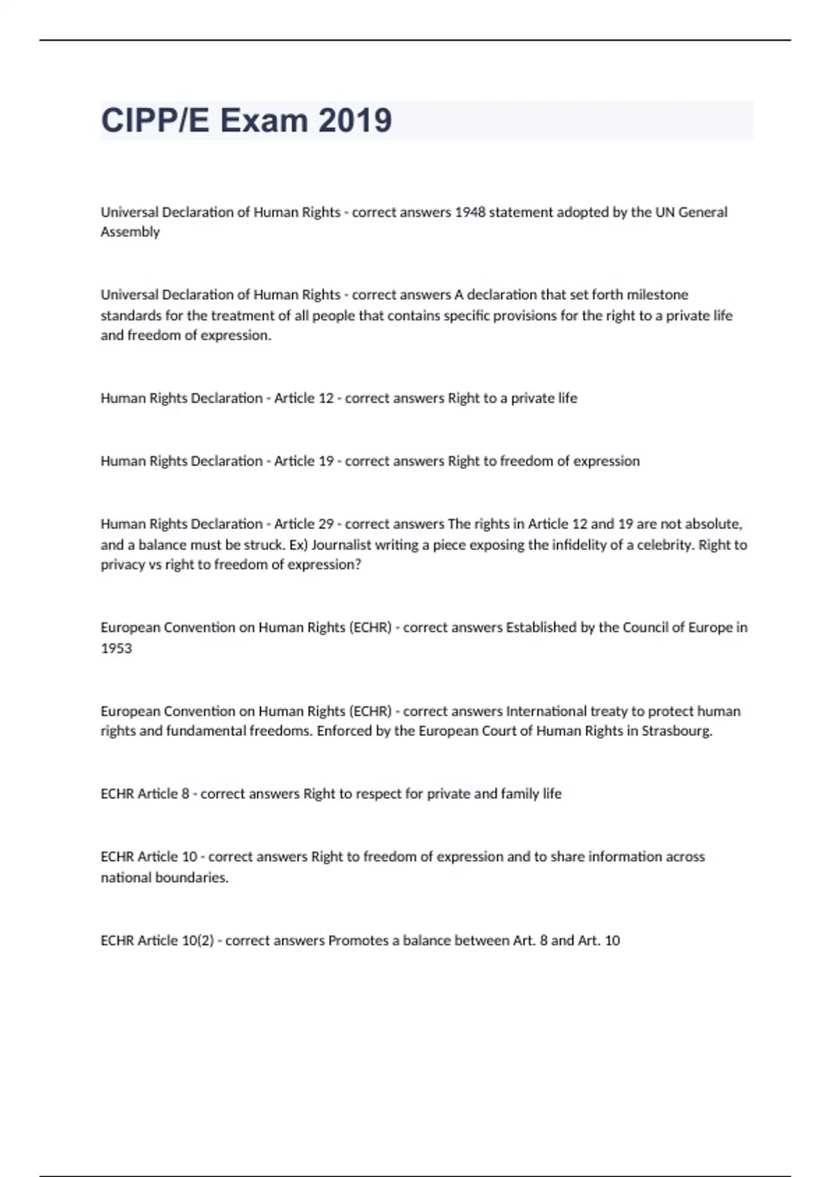 CIPPE Exam 2019(UPDATED) Question and answers already passed Universal Declaration of Human Rights - correct answers 1948 statement adopted by the UN General Assembly Universal Declaration of Human Rights - correct answers A declaration that set forth milestone standards for the treatment of all people that contains specific provisions for the right to a private life and freedom of expression. Human Rights Declaration - Article 12 - correct answers Right to a private life Human Rights Declaration - Article 19 - correct answers Right to freedom of expression Human Rights Declaration - Article 29 - correct answers The rights in Article 12 and 19 are not absolute, and a balance must be struck. Ex) Journalist writing a piece exposing the infidelity of a celebrity. Right to privacy vs right to freedom of expression? European Convention on Human Rights (ECHR) - correct answers Established by the Council of Europe in 1953 European Convention on Human Rights (ECHR) - correct answers International treaty to protect human rights and fundamental freedoms. Enforced by the European Court of Human Rights in Strasbourg.