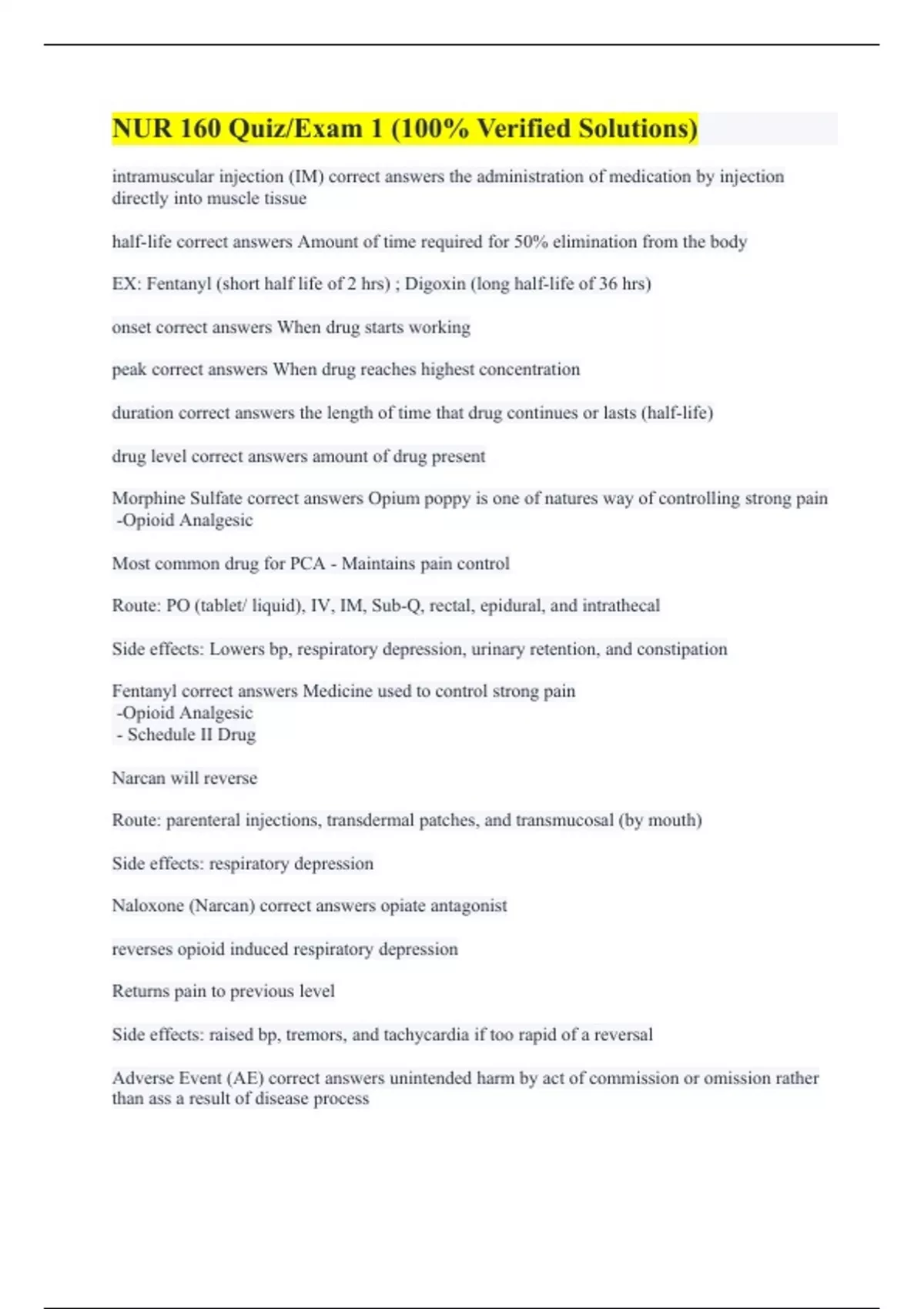 intramuscular injection (IM) correct answers the administration of medication by injection directly into muscle tissue half-life correct answers Amount of time required for 50% elimination from the body EX: Fentanyl (short half life of 2 hrs) ; Digoxin (long half-life of 36 hrs) onset correct answers When drug starts working peak correct answers When drug reaches highest concentration duration correct answers the length of time that drug continues or lasts (half-life) drug level correct answers amount of drug present Morphine Sulfate correct answers Opium poppy is one of natures way of controlling strong pain -Opioid Analgesic Most common drug for PCA - Maintains pain control Route: PO (tablet/ liquid), IV, IM, Sub-Q, rectal, epidural, and intrathecal Side effects: Lowers bp, respiratory depression, urinary retention, and constipation Fentanyl correct answers Medicine used to control strong pain -Opioid Analgesic - Schedule II Drug Narcan will reverse Route: parenteral injections, transdermal patches, and transmucosal (by mouth) Side effects: respiratory depression Naloxone (Narcan) correct answers opiate antagonist reverses opioid induced respiratory depression Returns pain to previous level Side effects: raised bp, tremors, and tachycardia if too rapid of a reversal Adverse Event (AE) correct answers unintended harm by act of commission or omission rather than ass a result of disease process