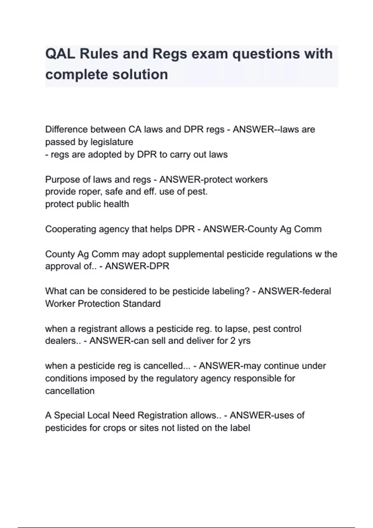 qal rules and regs exam questions with complete so