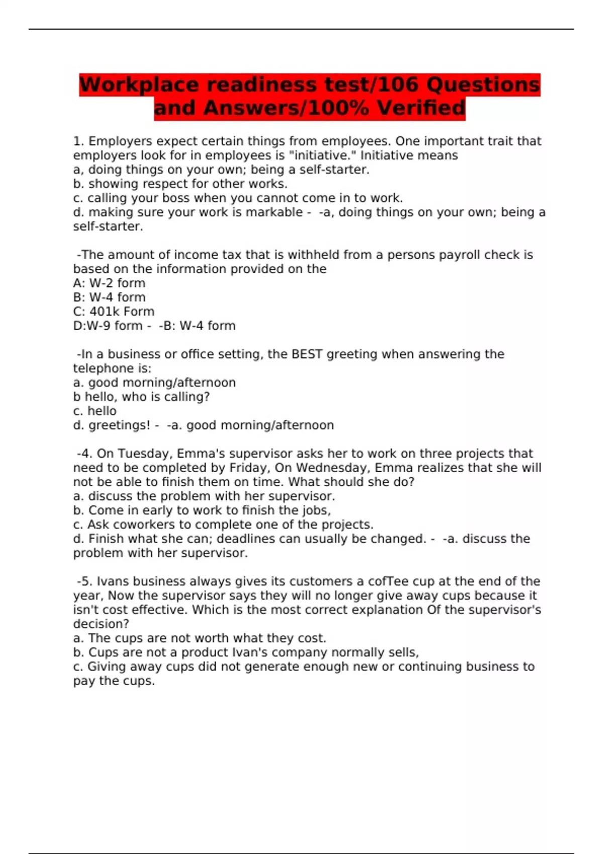 Workplace readiness test/106 Questions and Answers/100% Verified
