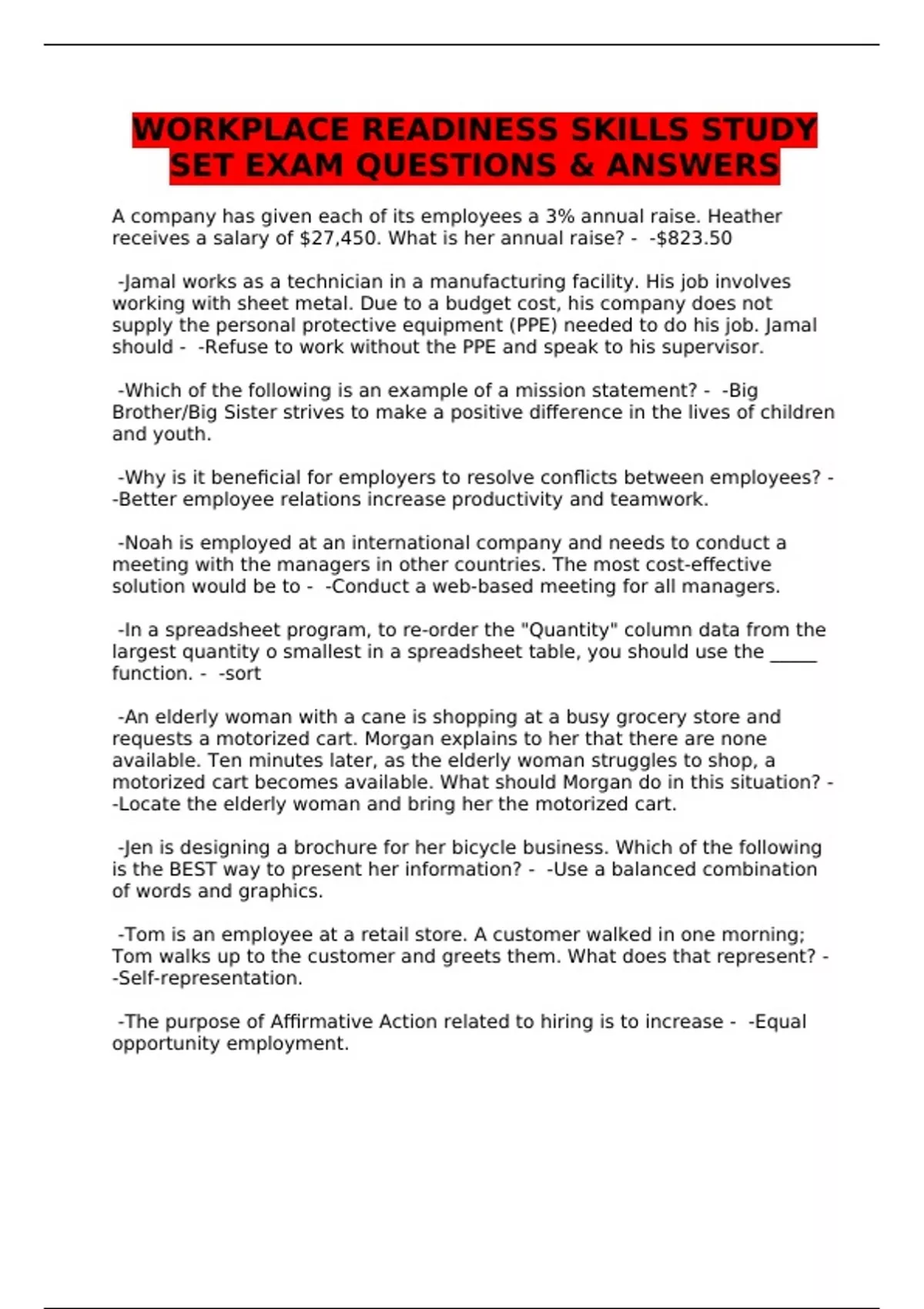 WORKPLACE READINESS SKILLS STUDY SET EXAM QUESTIONS & ANSWERS