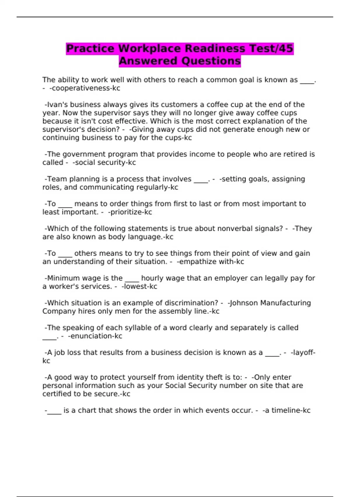 Practice Workplace Readiness Test/45 Answered Questions