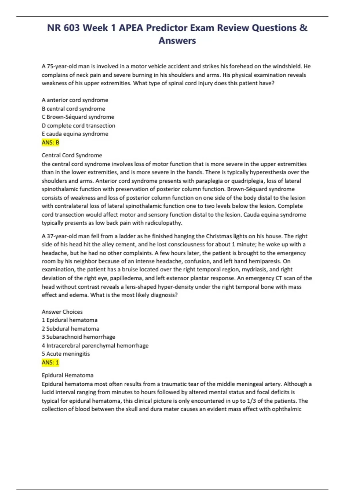 NR 603 Week 1 APEA Predictor Exam Review Questions & Answers A 75-year-old man is involved in a motor vehicle accident and strikes his forehead on the windshield. He complains of neck pain and severe burning in his shoulders and arms. His physical examination reveals weakness of his upper extremities. What type of spinal cord injury does this patient have? A anterior cord syndrome B central cord syndrome C Brown-Séquard syndrome D complete cord transection E cauda equina syndrome ANS: B Central Cord Syndrome the central cord syndrome involves loss of motor function that is more severe in the upper extremities than in the lower extremities, and is more severe in the hands. There is typically hyperesthesia over the shoulders and arms. Anterior cord syndrome presents with paraplegia or quadriplegia, loss of lateral spinothalamic function with preservation of posterior column function. Brown-Séquard syndrome consists of weakness and loss of posterior column function on one side of the body distal to the lesion with contralateral loss of lateral spinothalamic function one to two levels below the lesion. Complete cord transection would affect motor and sensory function distal to the lesion. Cauda equina syndrome typically presents as low back pain with radiculopathy. A 37-year-old man fell from a ladder as he finished hanging the Christmas lights on his house. The right side of his head hit the alley cement, and he lost consciousness for about 1 minute; he woke up with a headache, but he had no other complaints. A few hours later, the patient is brought to the emergency room by his neighbor because of an intense headache, confusion, and left hand hemiparesis. On examination, the patient has a bruise located over the right temporal region, mydriasis, and right deviation of the right eye, papilledema, and left extensor plantar response. An emergency CT scan of the head without contrast reveals a lens-shaped hyper-density under the right temporal bone with mass effect and edema. What is the most likely diagnosis? Answer Choices 1 Epidural hematoma 2 Subdural hematoma 3 Subarachnoid hemorrhage 4 Intracerebral parenchymal hemorrhage 5 Acute meningitis ANS: 1 Epidural Hematoma Epidural hematoma most often results from a traumatic tear of the middle meningeal artery. Although a lucid interval ranging from minutes to hours followed by altered mental status and focal deficits is typical for epidural hematoma, this clinical picture is only encountered in up to 1/3 of the patients. The collection of blood between the skull and dura mater causes an evident mass effect with ophthalmic NR 603 Week 1 APEA Predictor Exam Review Questions & Answers nerve palsy and the contralateral hemiparesis. Surgical evacuation of the clot via burr holes is the treatment of choice. Subdural hematoma results from a traumatic rupture of the bridging veins that connect the cerebrum to the venous sinuses within the dura. This venous hemorrhage will result in a gradual increase of the hematoma, with a progressive clinical picture over days or weeks. The CT scan will show a concave, crescent-shaped hyper-density compared to the convex, lens-shaped hyper-density in epidural hematoma. Subarachnoid hemorrhage is the result of an aneurysm rupture; the most common is the congenital berry aneurysm. The clinical picture is of a sudden, severe headache with meningeal irritation. A CT scan will show blood in the subarachnoid space, and a lumbar puncture will reveal xanthochromia CSF. Intracerebral parenchymal hemorrhage is most likely caused by hypertension complicated with CharcotBouchard aneurysms. The blood accumulates into the brain substance and most commonly involves the basal ganglia. Acute meningitis is not associated with trauma. Fever and signs of meningeal irritation dominate the clinical picture. Lumbar puncture, indicated if there are no focal neurological signs on clinical examination, will be the diagnostic procedure. The CT scan of the patient presented in this case is characteristic for epidural hematoma, and there is no indication for a lumbar puncture. A 31-year-old woman presents with a purpural rash covering her arms, legs, and abdomen. She also has fever, chills, nausea, abdominal tenderness, tachycardia, and generalized myalgias. Prior to the development of the rash, the patient noted that she had a headache, cough, and sore throat. Laboratory studies were positive for Gram-negative diplococci in the blood, along with thrombocytopenia and an elevation in PMNs. Urinalysis showed blood, protein, and casts. Vital signs are as follows: PB 92/66, P 96, RR 14, T 39. The patient denies any foreign travel and does not have any sick contacts. However, she does work part time as a nurse in a local hospital. Question The patient is diagnosed with Meningococcemia; she is admitted to the hospital and placed in respiratory isolation. What major course of therapy should this patient receive? Answer Choices 1 Steroids 2 Supportive care 3 Antibiotics 4 Transfusion 5 Bactericidal/permeability-increasing protein ANS:3 NR 603 Week 1 APEA Predictor Exam Review Questions & Answers Antibiotics Antibiotics are the treatment of choice for meningococcemia. The preferred drug for active infection is penicillin G. For those allergic to penicillin, chloramphenicol and cephalosporins (ie, cefotaxime, cefuroxime) may be used as alternatives. Patients will also receive supportive care, but antibiotic therapy must be initiated quickly if the patient is to survive. Intensive care placement may be necessary if organ failure is imminent. Ventilatory support, inotropic support, and IV fluids are necessary in some. If adrenal insufficiency occurs, corticosteroid replacement may be considered. A central venous line helps to provide large amounts of volume expanders and inotropic medications for adequate tissue perfusion. Steroids have not been shown to play a major role in the treatment of meningococcemia. However, they have been used in addition to an