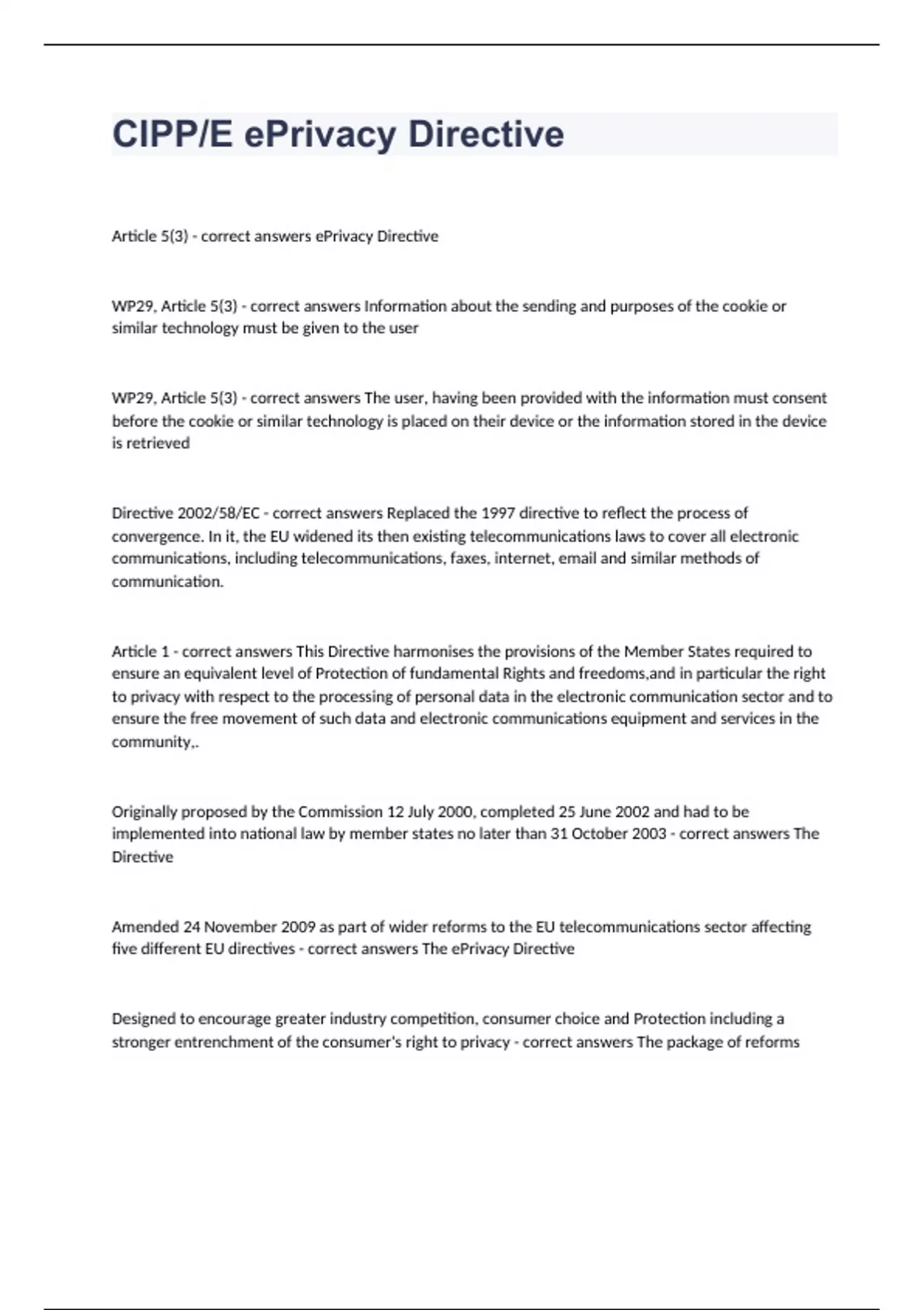CIPPE ePrivacy Directive Questions with complete solution 2023/2024 Article 5(3) - correct answers ePrivacy Directive WP29, Article 5(3) - correct answers Information about the sending and purposes of the cookie or similar technology must be given to the user WP29, Article 5(3) - correct answers The user, having been provided with the information must consent before the cookie or similar technology is placed on their device or the information stored in the device is retrieved Directive 2002/58/EC - correct answers Replaced the 1997 directive to reflect the process of convergence. In it, the EU widened its then existing telecommunications laws to cover all electronic communications, including telecommunications, faxes, internet, email and similar methods of communication. Article 1 - correct answers This Directive harmonises the provisions of the Member States required to ensure an equivalent level of Protection of fundamental Rights and freedoms,and in particular the right to privacy with res