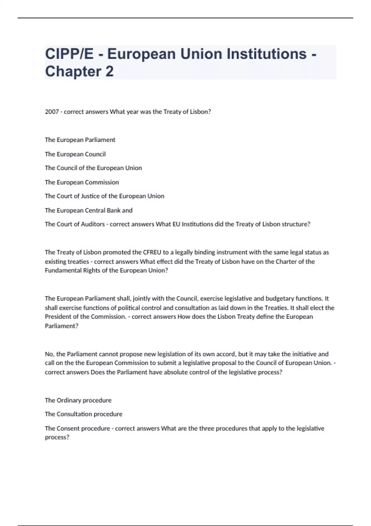CIPPE - European Union Institutions - Chapter 2 Question and answers 100% correct 2023/ - correct answers What year was the Treaty of Lisbon? The European Parliament The European Council The Council of the European Union The European Commission The Court of Justice of the European Union The European Central Bank and The Court of Auditors - correct answers What EU Institutions did the Treaty of Lisbon structure? The Treaty of Lisbon promoted the CFREU to a legally binding instrument with the same legal status as existing treaties - correct answers What effect did the Treaty of Lisbon have on the Charter of the Fundamental Rights of the European Union? The European Parliament shall, jointly with the Council, exercise legislative and budgetary functions. It shall exercise functions of political control and consultation as laid down in the Treaties. It shall elect the President of the Commission. - correct answers How does the Lisbon Treaty define the European Parliament? No, the Parliament cannot propose new legislation of its own accord, but it may take the initiative and call on the the European Commission to submit a legislative proposal to the Council of European Union. - correct answers Does the Parliament have absolute control of the legislative process? The Ordinary procedure The Consultation procedure The Consent procedure - correct answers What are the three procedures that apply to the legislative process?
