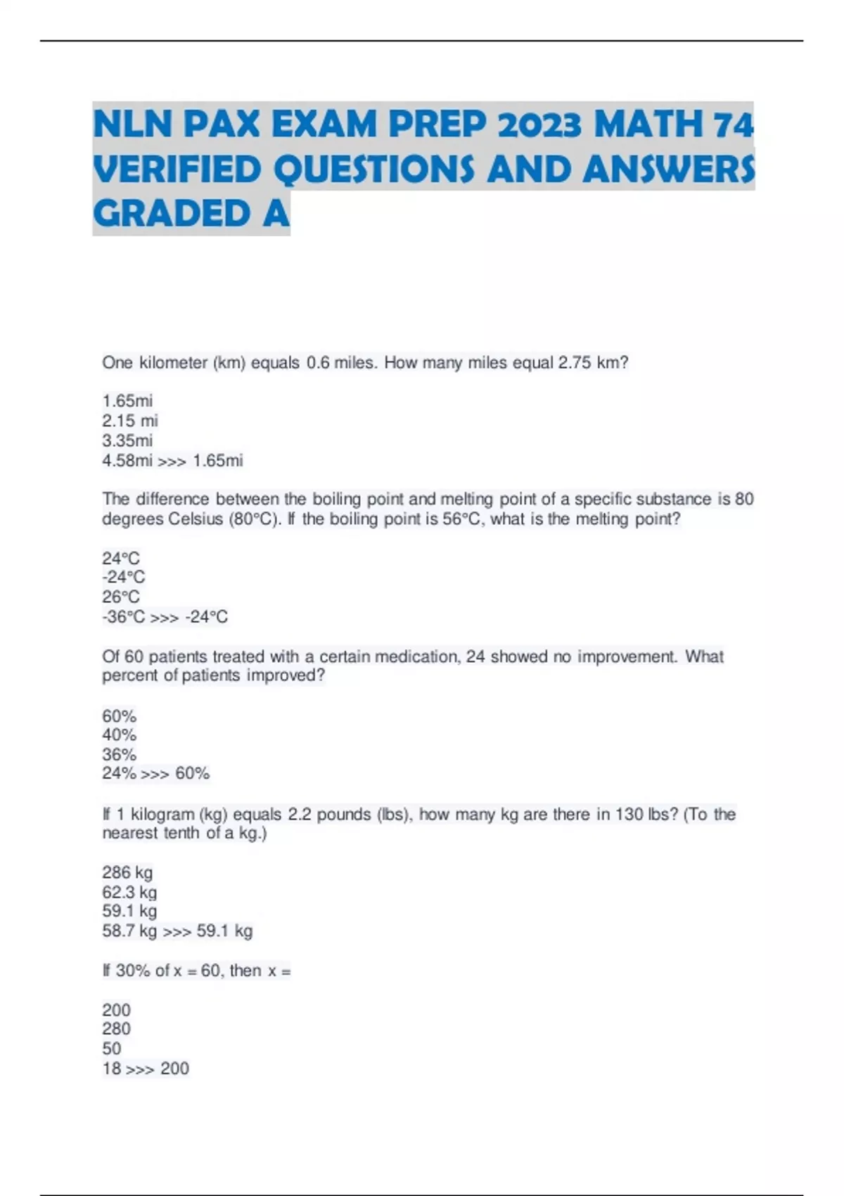 NLN PAX EXAM PREP 2024 MATH 74 VERIFIED QUESTIONS AND ANSWERS GRADED A