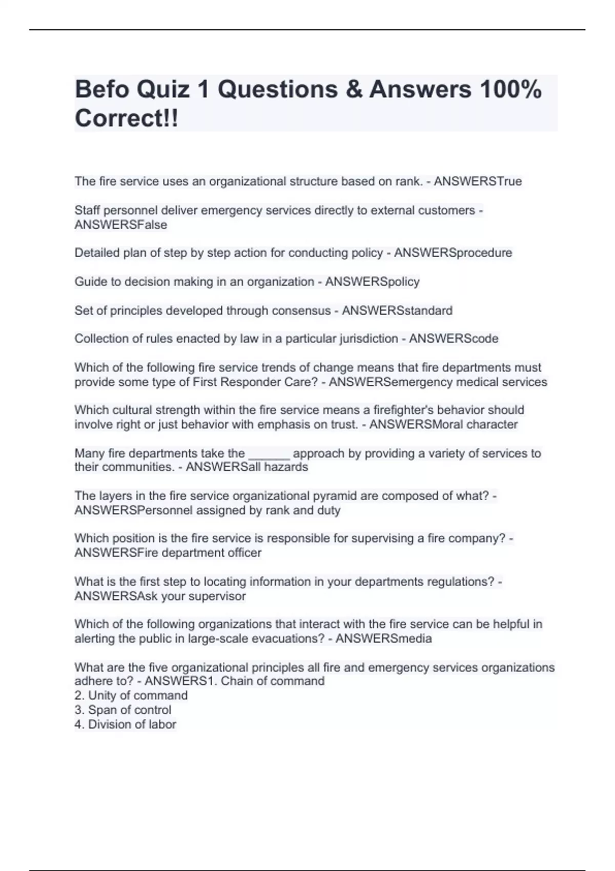 Befo Quiz 1 Questions & Answers 100% Correct!!