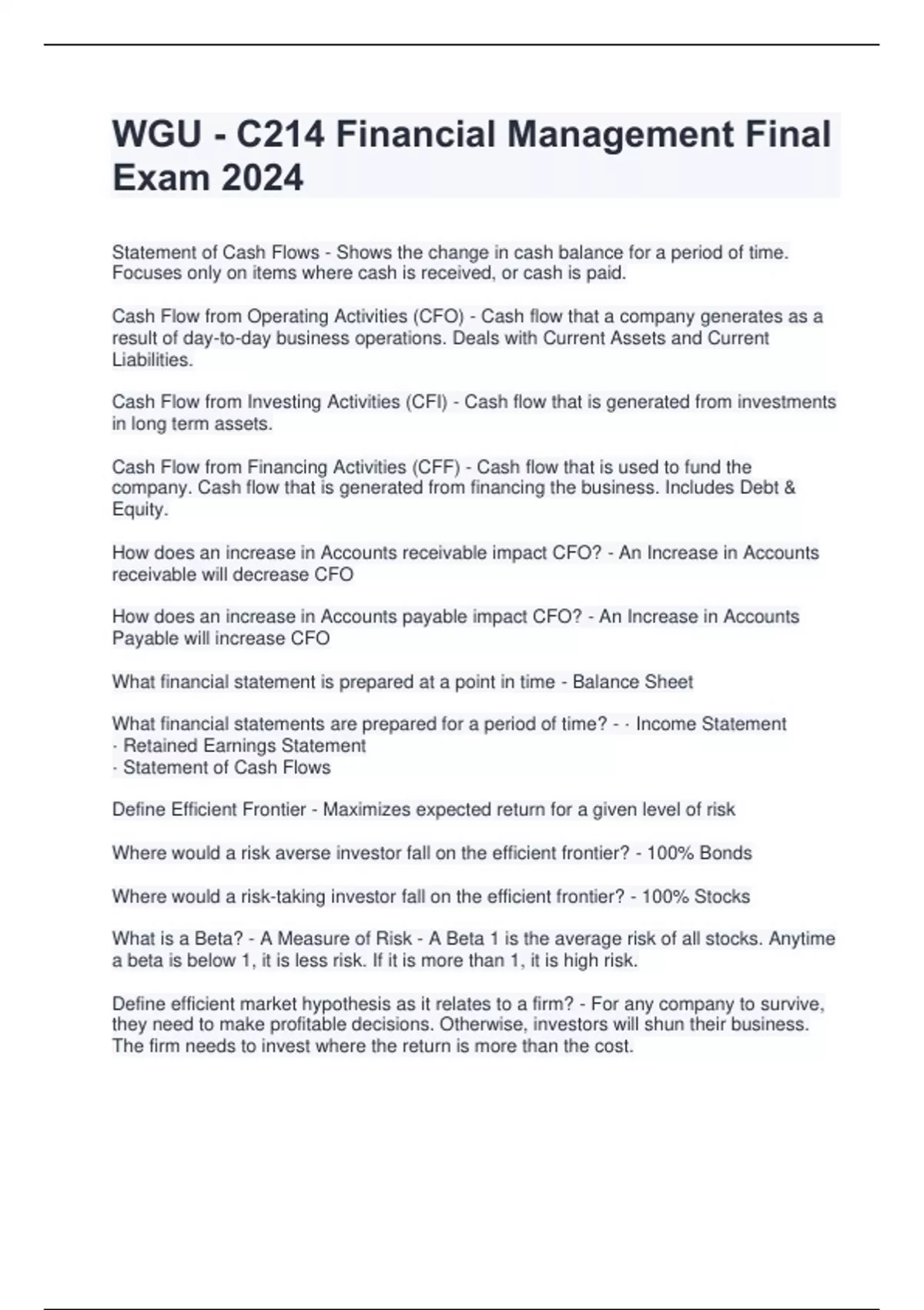 Statement of Cash Flows - Shows the change in cash balance for a period of time. Focuses only on items where cash is received, or cash is paid. Cash Flow from Operating Activities (CFO) - Cash flow that a company generates as a result of day-to-day business operations. Deals with Current Assets and Current Liabilities. Cash Flow from Investing Activities (CFI) - Cash flow that is generated from investments in long term assets. Cash Flow from Financing Activities (CFF) - Cash flow that is used to fund the company. Cash flow that is generated from financing the business. Includes Debt & Equity. How does an increase in Accounts receivable impact CFO? - An Increase in Accounts receivable will decrease CFO How does an increase in Accounts payable impact CFO? - An Increase in Accounts Payable will increase CFO What financial statement is prepared at a point in time - Balance Sheet What financial statements are prepared for a period of time? - · Income Statement · Retained Earnings Statement · Statement of Cash Flows Define Efficient Frontier - Maximizes expected return for a given level of risk Where would a risk averse investor fall on the efficient frontier? - 100% Bonds Where would a risk-taking investor fall on the efficient frontier? - 100% Stocks What is a Beta? - A Measure of Risk - A Beta 1 is the average risk of all stocks. Anytime a beta is below 1, it is less risk. If it is more than 1, it is high risk. Define efficient market hypothesis as it relates to a firm? - For any company to survive, they need to make profitable decisions. Otherwise, investors will shun their business. The firm needs to invest where the return is more than the cost.