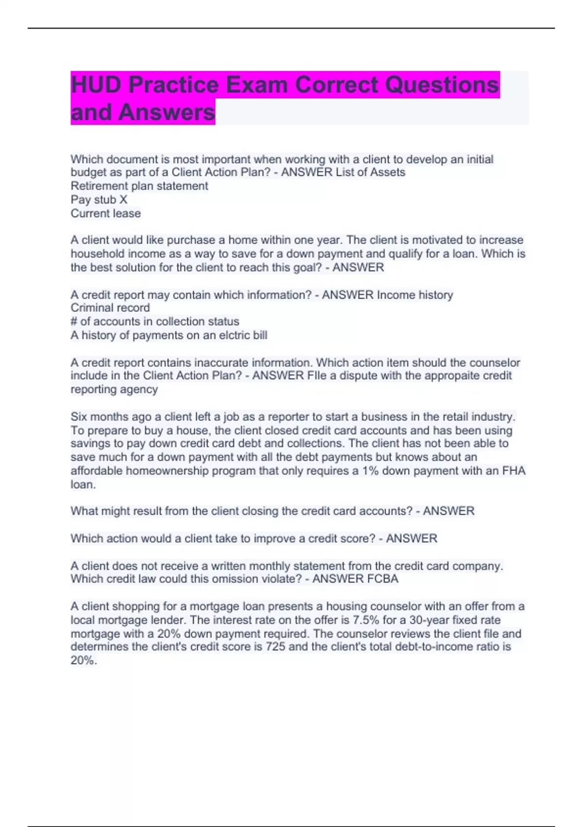 Which document is most important when working with a client to develop an initial budget as part of a Client Action Plan? - ANSWER List of Assets Retirement plan statement Pay stub X Current lease A client would like purchase a home within one year. The client is motivated to increase household income as a way to save for a down payment and qualify for a loan. Which is the best solution for the client to reach this goal? - ANSWER A credit report may contain which information? - ANSWER Income history Criminal record # of accounts in collection status A history of payments on an elctric bill A credit report contains inaccurate information. Which action item should the counselor include in the Client Action Plan? - ANSWER FIle a dispute with the appropaite credit reporting agency Six months ago a client left a job as a reporter to start a business in the retail industry. To prepare to buy a house, the client closed credit card accounts and has been using savings to pay down credit card debt and collections. The client has not been able to save much for a down payment with all the debt payments but knows about an affordable homeownership program that only requires a 1% down payment with an FHA loan. What might result from the client closing the credit card accounts? - ANSWER Which action would a client take to improve a credit score? - ANSWER