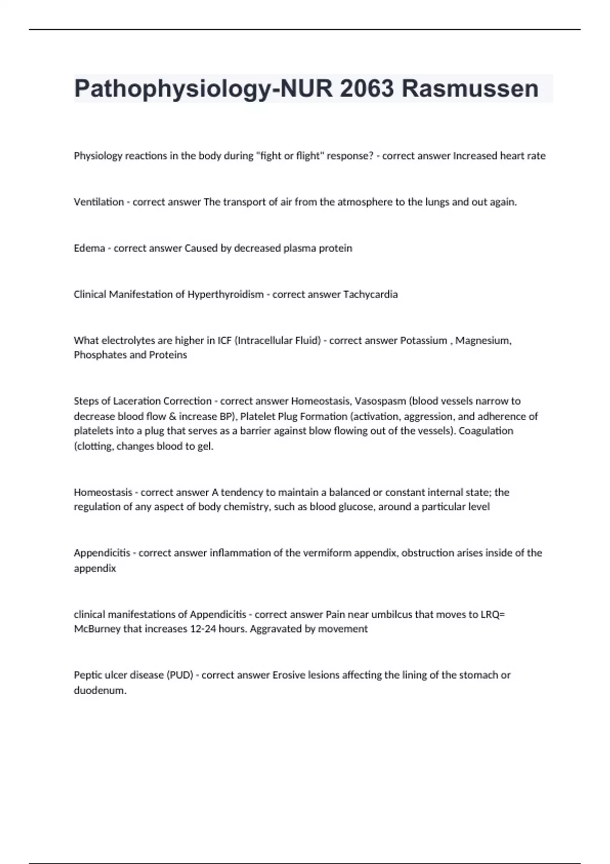 Pathophysiology-NUR 2063 Rasmussen Physiology reactions in the body during "fight or flight" response? - correct answer Increased heart rate Ventilation - correct answer The transport of air from the atmosphere to the lungs and out again. Edema - correct answer Caused by decreased plasma protein Clinical Manifestation of Hyperthyroidism - correct answer Tachycardia What electrolytes are higher in ICF (Intracellular Fluid) - correct answer Potassium , Magnesium, Phosphates and Proteins Steps of Laceration Correction - correct answer Homeostasis, Vasospasm (blood vessels narrow to decrease blood flow & increase BP), Platelet Plug Formation (activation, aggression, and adherence of platelets into a plug that serves as a barrier against blow flowing out of the vessels). Coagulation (clotting, changes blood to gel. Homeostasis - correct answer A tendency to maintain a balanced or constant internal state; the regulation of any aspect of body chemistry, such as blood glucose, around a particular level Appendicitis - correct answer inflammation of the vermiform appendix, obstruction arises inside of the appendix clinical manifestations of Appendicitis - correct answer Pain near umbilcus that moves to LRQ= McBurney that increases 12-24 hours. Aggravated by movement Peptic ulcer disease (PUD) - correct answer Erosive lesions affecting the lining of the stomach or duodenum.