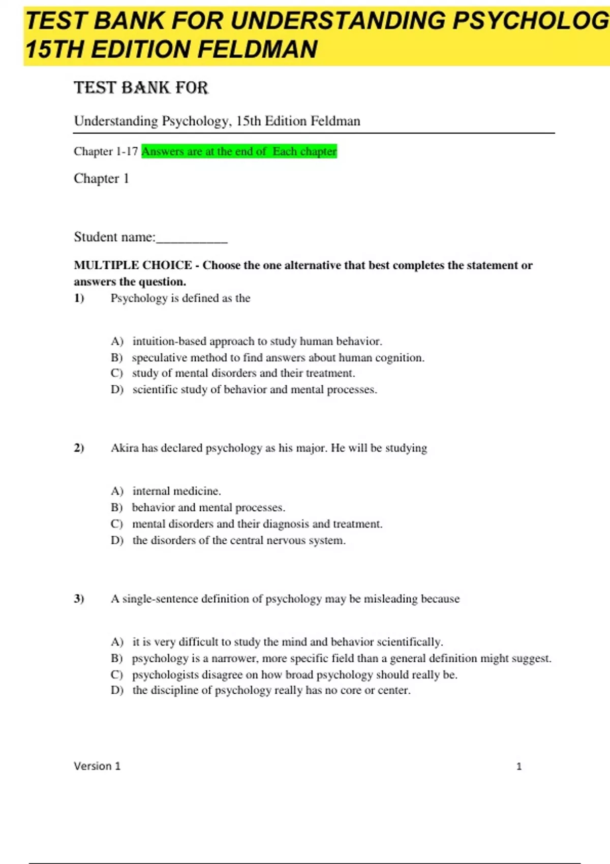 Test Bank for Understanding Psychology, 15th Edition by Robert Feldman Table of Contents: Chapter 1: Introduction to Psychology Chapter 2: Psychological Research Chapter 3: Neuroscience and Behavior Chapter 4: Sensation and Perception Chapter 5: States of Consciousness Chapter 6: Learning Chapter 7: Memory Chapter 8: Cognition and Language Chapter 9: Intelligence Chapter 10: Motivation and Emotion Chapter 11: Sexuality and Gender Chapter 12: Development Chapter 13: Personality Chapter 14: Health Psychology: Stress, Coping, and Well-Being Chapter 15: Psychological Disorders Chapter 16: Treatment of Psychological Disorders Chapter 17: Social Psychology