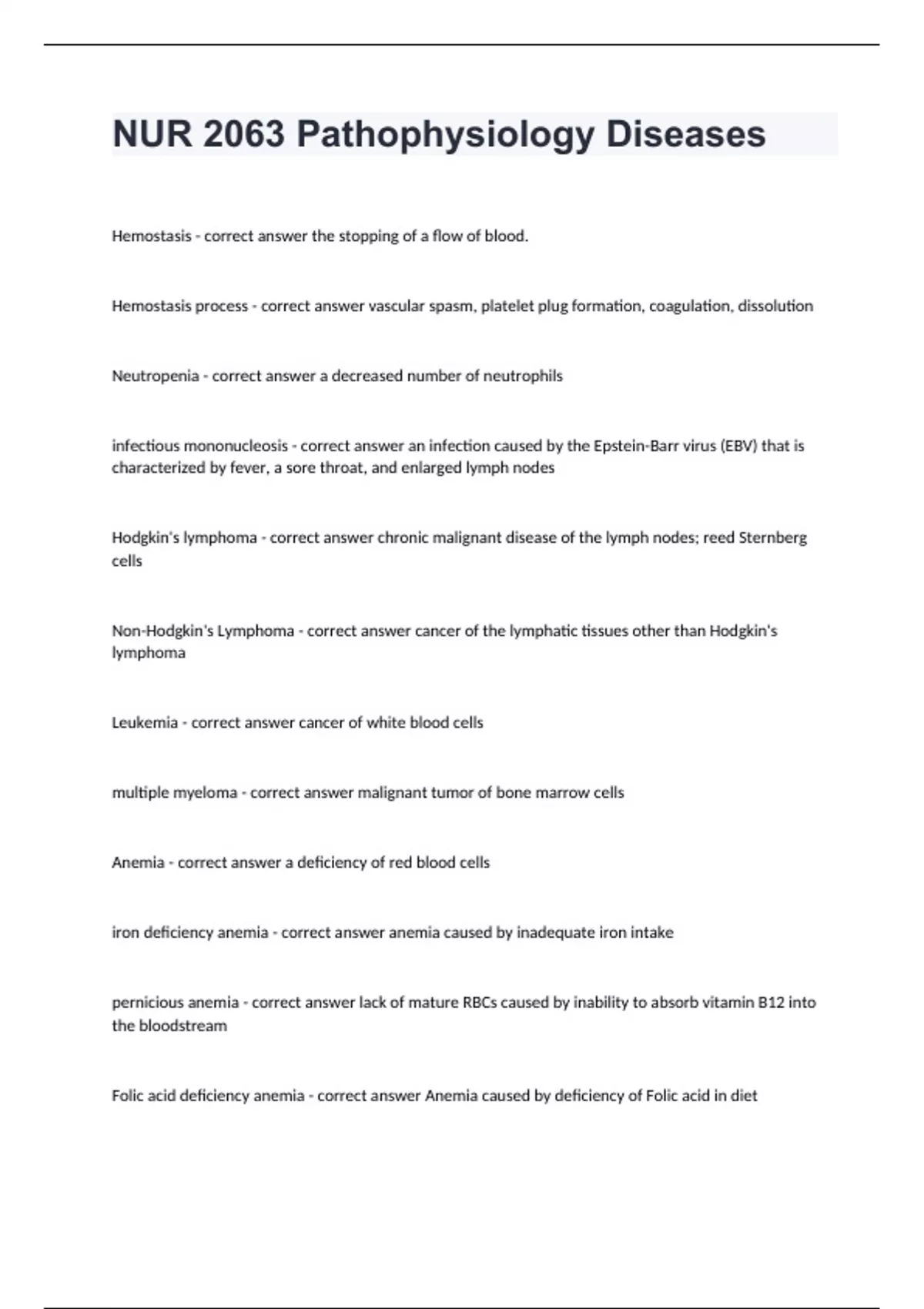 NUR 2063 Pathophysiology Diseases Hemostasis - correct answer the stopping of a flow of blood. Hemostasis process - correct answer vascular spasm, platelet plug formation, coagulation, dissolution Neutropenia - correct answer a decreased number of neutrophils infectious mononucleosis - correct answer an infection caused by the Epstein-Barr virus (EBV) that is characterized by fever, a sore throat, and enlarged lymph nodes Hodgkin's lymphoma - correct answer chronic malignant disease of the lymph nodes; reed Sternberg cells Non-Hodgkin's Lymphoma - correct answer cancer of the lymphatic tissues other than Hodgkin's lymphoma Leukemia - correct answer cancer of white blood cells multiple myeloma - correct answer malignant tumor of bone marrow cells Anemia - correct answer a deficiency of red blood cells iron deficiency anemia - correct answer anemia caused by inadequate iron intake pernicious anemia - correct answer lack of mature RBCs caused by inability to absorb vitamin B12 into the bloodstream Folic acid deficiency anemia - correct answer Anemia caused by deficiency of Folic acid in diet