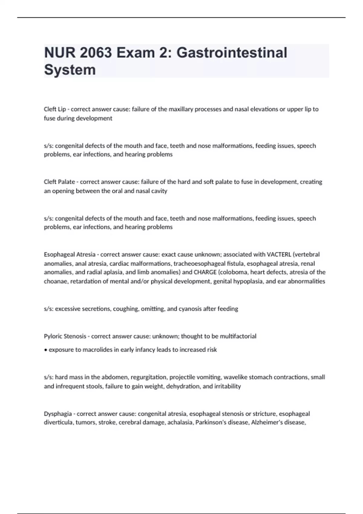 NUR 2063 Exam 2: Gastrointestinal SystemCleft Lip - correct answer cause: failure of the maxillary processes and nasal elevations or upper lip to fuse during development s/s: congenital defects of the mouth and face, teeth and nose malformations, feeding issues, speech problems, ear infections, and hearing problems Cleft Palate - correct answer cause: failure of the hard and soft palate to fuse in development, creating an opening between the oral and nasal cavity s/s: congenital defects of the mouth and face, teeth and nose malformations, feeding issues, speech problems, ear infections, and hearing problems Esophageal Atresia - correct answer cause: exact cause unknown; associated with VACTERL (vertebral anomalies, anal atresia, cardiac malformations, tracheoesophageal fistula, esophageal atresia, renal anomalies, and radial aplasia, and limb anomalies) and CHARGE (coloboma, heart defects, atresia of the choanae, retardation of mental and/or physical development, genital hypoplasia, and ear abnormalities s/s: excessive secretions, coughing, omitting, and cyanosis after feeding Pyloric Stenosis - correct answer cause: unknown; thought to be multifactorial • exposure to macrolides in early infancy leads to increased risk s/s: hard mass in the abdomen, regurgitation, projectile vomiting, wavelike stomach contractions, small and infrequent stools, failure to gain weight, dehydration, and irritability Dysphagia - correct answer cause: congenital atresia, esophageal stenosis or stricture, esophageal diverticula, tumors, stroke, cerebral damage, achalasia, Parkinson's disease, Alzheimer's disease,