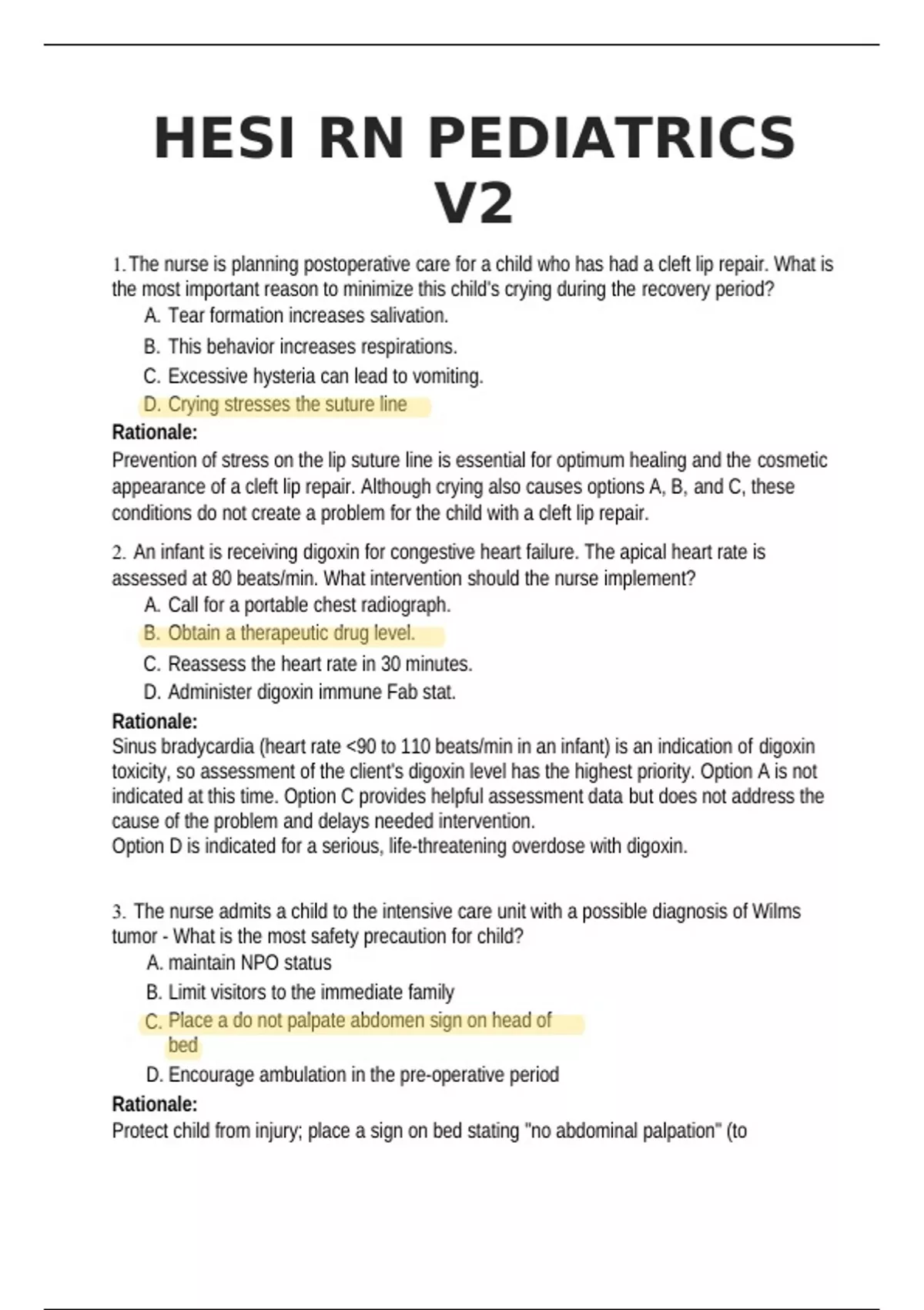 HESI RN PEDIATRICS V2 1. The nurse is planning postoperative care for a child who has had a cleft lip repair. What is the most important reason to minimize this child's crying during the recovery period? A. Tear formation increases salivation. B. This behavior increases respirations. C. Excessive hysteria can lead to vomiting. D. Crying stresses the suture line Rationale: Prevention of stress on the lip suture line is essential for optimum healing and the cosmetic appearance of a cleft lip repair. Although crying also causes options A, B, and C, these conditions do not create a problem for the child with a cleft lip repair. 2. An infant is receiving digoxin for congestive heart failure. The apical heart rate is assessed at 80 beats/min. What intervention should the nurse implement? A. Call for a portable chest radiograph. B. Obtain a therapeutic drug level. C. Reassess the heart rate in 30 minutes. D. Administer digoxin immune Fab stat. Rationale: Sinus bradycardia (heart rate 90 to 110 beats/min in an infant) is an indication of digoxin toxicity, so assessment of the client's digoxin level has the highest priority. Option A is not indicated at this time. Option C provides helpful assessment data but does not address the cause of the problem and delays needed intervention. Option D is indicated for a serious, life-threatening overdose with digoxin.