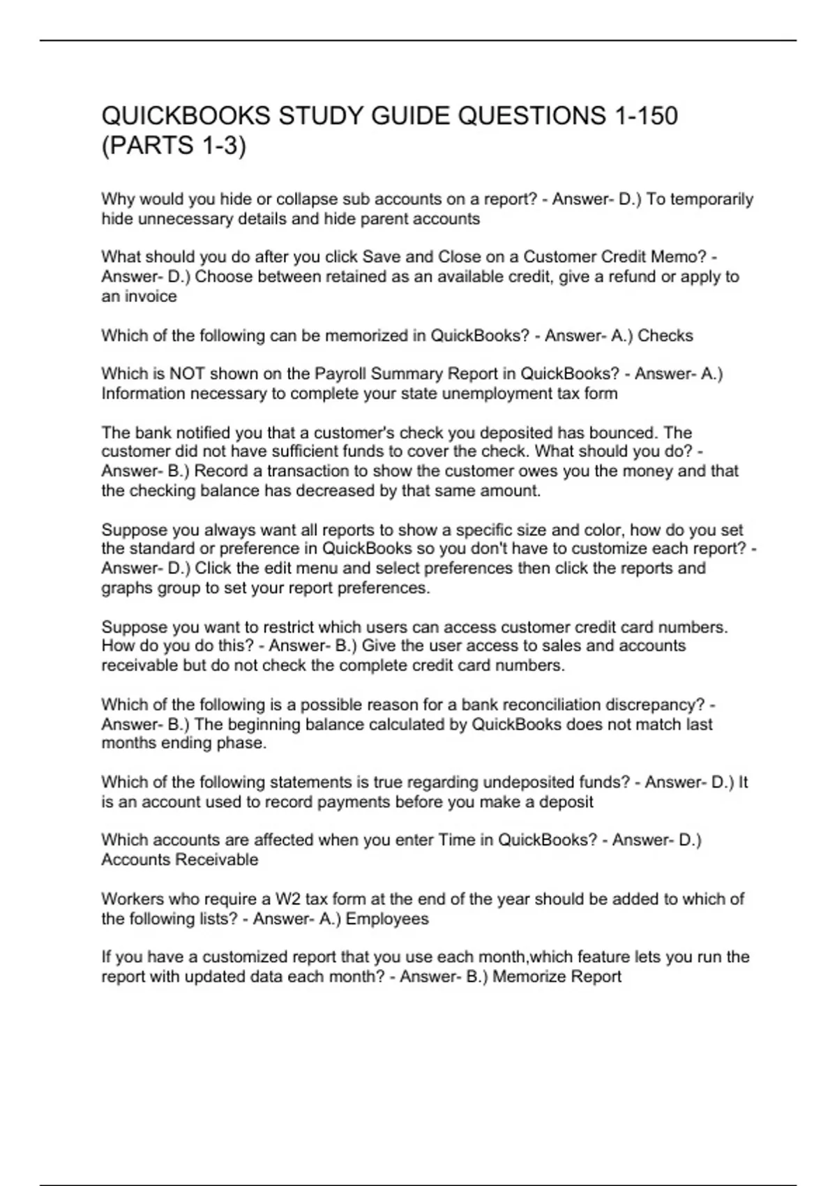 QUICKBOOKS STUDY GUIDE QUESTIONS 1-150 (PARTS 1-3)