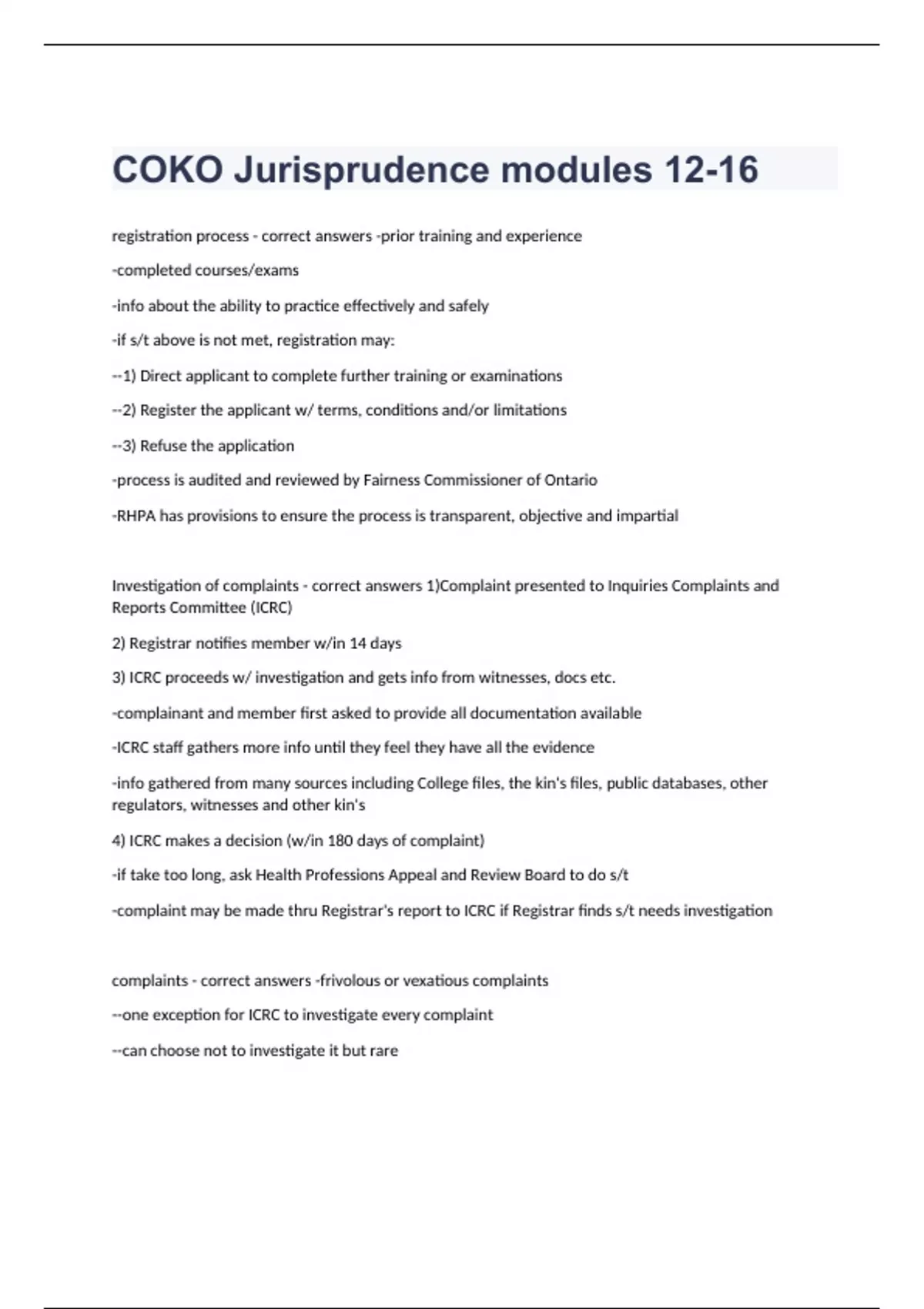 COKO Jurisprudence modules 12-16 Questions with complete solution 2023/2024registration process - correct answers -prior training and experience -completed courses/exams -info about the ability to practice effectively and safely -if s/t above is not met, registration may: --1) Direct applicant to complete further training or examinations --2) Register the applicant w/ terms, conditions and/or limitations --3) Refuse the application -process is audited and reviewed by Fairness Commissioner of Ontario -RHPA has provisions to ensure the process is transparent, objective and impartial Investigation of complaints - correct answers 1)Complaint presented to Inquiries Complaints and Reports Committee (ICRC) 2) Registrar notifies member w/in 14 days 3) ICRC proceeds w/ investigation and gets info from witnesses, docs etc. -complainant and member first asked to provide all documentation available -ICRC staff gathers more info until they feel they have all the evidence -info gathered from many sources including College files, the kin's files, public databases, other regulators, witnesses and other kin's 4) ICRC makes a decision (w/in 180 days of complaint) -if take too long, ask Health Professions Appeal and Review Board to do s/t -complaint may be made thru Registrar's report to ICRC if Registrar finds s/t needs investigation complaints - correct answers -frivolous or vexatious complaints --one exception for ICRC to investiga