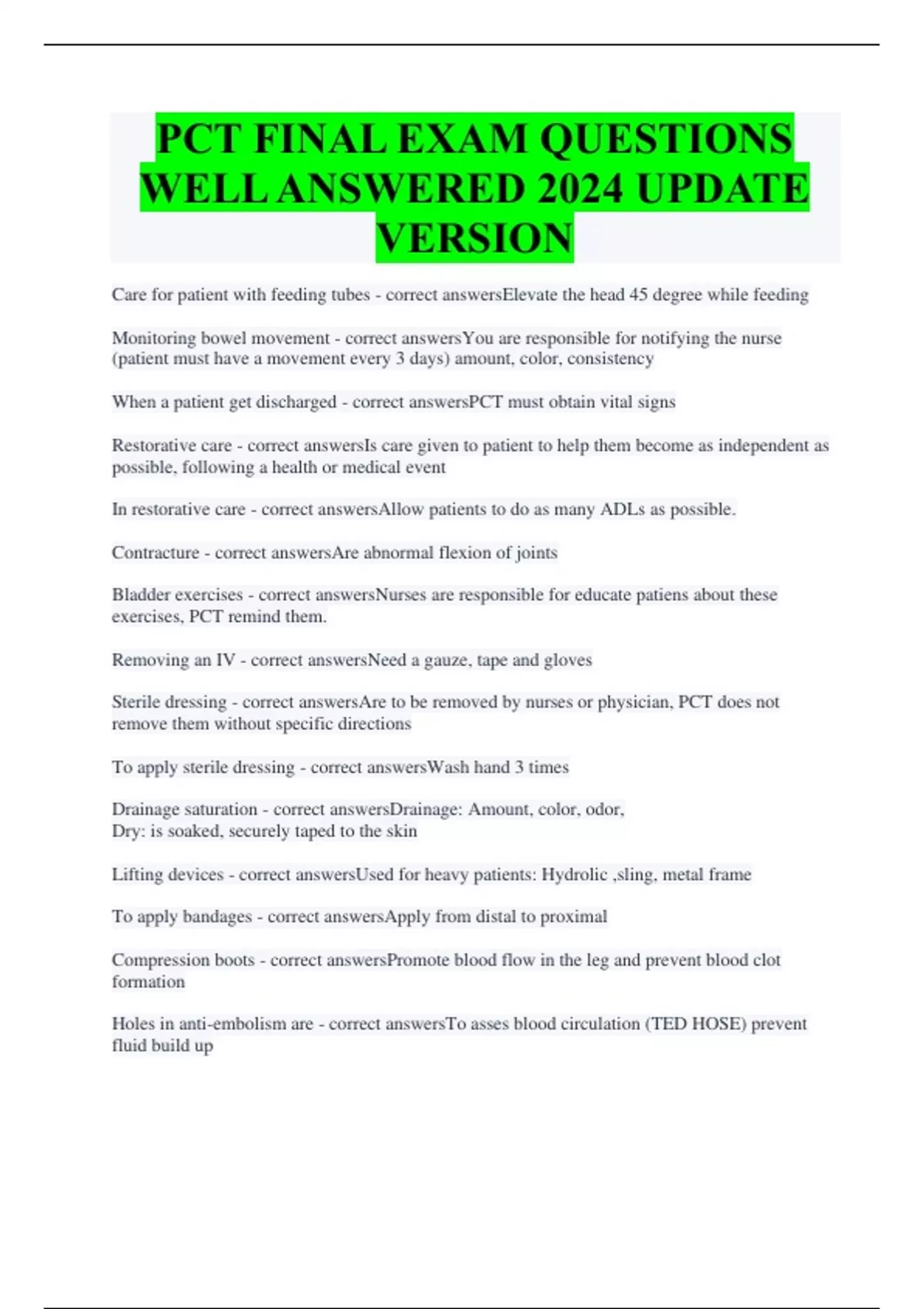 PCT FINAL EXAM QUESTIONS WELL ANSWERED 2024 UPDATE VERSION Care for patient with feeding tubes - correct answersElevate the head 45 degree while feeding Monitoring bowel movement - correct answersYou are responsible for notifying the nurse (patient must have a movement every 3 days) amount, color, consistency When a patient get discharged - correct answersPCT must obtain vital signs Restorative care - correct answersIs care given to patient to help them become as independent as possible, following a health or medical event In restorative care - correct answersAllow patients to do as many ADLs as possible. Contracture - correct answersAre abnormal flexion of joints Bladder exercises - correct answersNurses are responsible for educate patiens about these exercises, PCT remind them. Removing an IV - correct answersNeed a gauze, tape and gloves Sterile dressing - correct answersAre to be removed by nurses or physician, PCT does not remove them without specific directions To apply sterile dressing - correct answersWash hand 3 times Drainage saturation - correct answersDrainage: Amount, color, odor, Dry: is soaked, securely taped to the skin Lifting devices - correct answersUsed for heavy patients: Hydrolic ,sling, metal frame To apply bandages - correct answersApply from distal to proximal Compression boots - correct answersPromote blood flow in the leg and prevent blood clot formation Holes in anti-embolism are - correct answersTo asses blood circulation (TED HOSE) prevent fluid build up