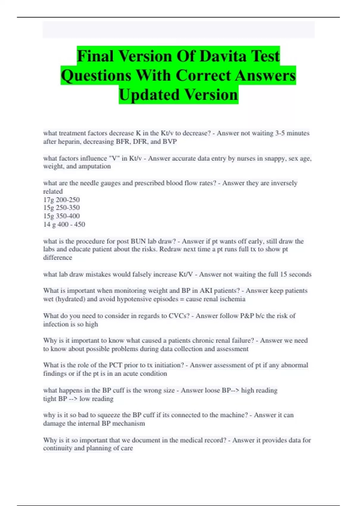 Final Version Of Davita Test Questions With Correct Answers Updated Version what treatment factors decrease K in the Kt/v to decrease? - Answer not waiting 3-5 minutes after heparin, decreasing BFR, DFR, and BVP what factors influence "V" in Kt/v - Answer accurate data entry by nurses in snappy, sex age, weight, and amputation what are the needle gauges and prescribed blood flow rates? - Answer they are inversely related 17g 200-250 15g 250-350 15g 350-400 14 g 400 - 450 what is the procedure for post BUN lab draw? - Answer if pt wants off early, still draw the labs and educate patient about the risks. Redraw next time a pt runs full tx to show pt difference what lab draw mistakes would falsely increase Kt/V - Answer not waiting the full 15 seconds What is important when monitoring weight and BP in AKI patients? - Answer keep patients wet (hydrated) and avoid hypotensive episodes = cause renal ischemia What do you need to consider in regards to CVCs? - Answer follow P&P b/c the risk of infection is so high Why is it important to know what caused a patients chronic renal failure? - Answer we need to know about possible problems during data collection and assessment What is the role of the PCT prior to tx initiation? - Answer assessment of pt if any abnormal findings or if the pt is in an acute condition what happens in the BP cuff is the wrong size - Answer loose BP--> high reading tight BP --> low reading why is it so bad to squeeze the BP cuff if its connected to the machine? - Answer it can damage the internal BP mechanism Why is it so important that we document in the medical record? - Answer it provides data for continuity and planning of care