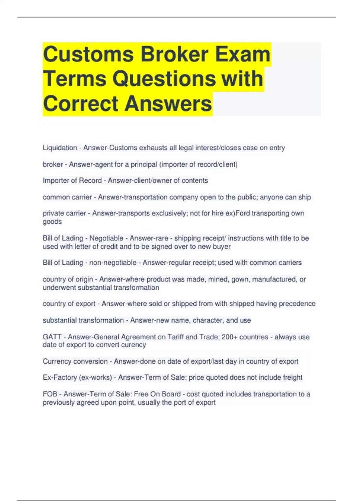 Customs Broker Exam Terms Questions with Correct Answers Liquidation - Answer-Customs exhausts all legal interest/closes case on entry broker - Answer-agent for a principal (importer of record/client) Importer of Record - Answer-client/owner of contents common carrier - Answer-transportation company open to the public; anyone can ship private carrier - Answer-transports exclusively; not for hire ex)Ford transporting own goods Bill of Lading - Negotiable - Answer-rare - shipping receipt/ instructions with title to be used with letter of credit and to be signed over to new buyer Bill of Lading - non-negotiable - Answer-regular receipt; used with common carriers country of origin - Answer-where product was made, mined, gown, manufactured, or underwent substantial transformation country of export - Answer-where sold or shipped from with shipped having precedence substantial transformation - Answer-new name, character, and use GATT - Answer-General Agreement on Tariff and Trade; 200+ countries - always use date of export to convert curency Currency conversion - Answer-done on date of export/last day in country of export Ex-Factory (ex-works) - Answer-Term of Sale: price quoted does not include freight FOB - Answer-Term of Sale: Free On Board - cost quoted includes transportation to a previously agreed upon point, usually the port of export