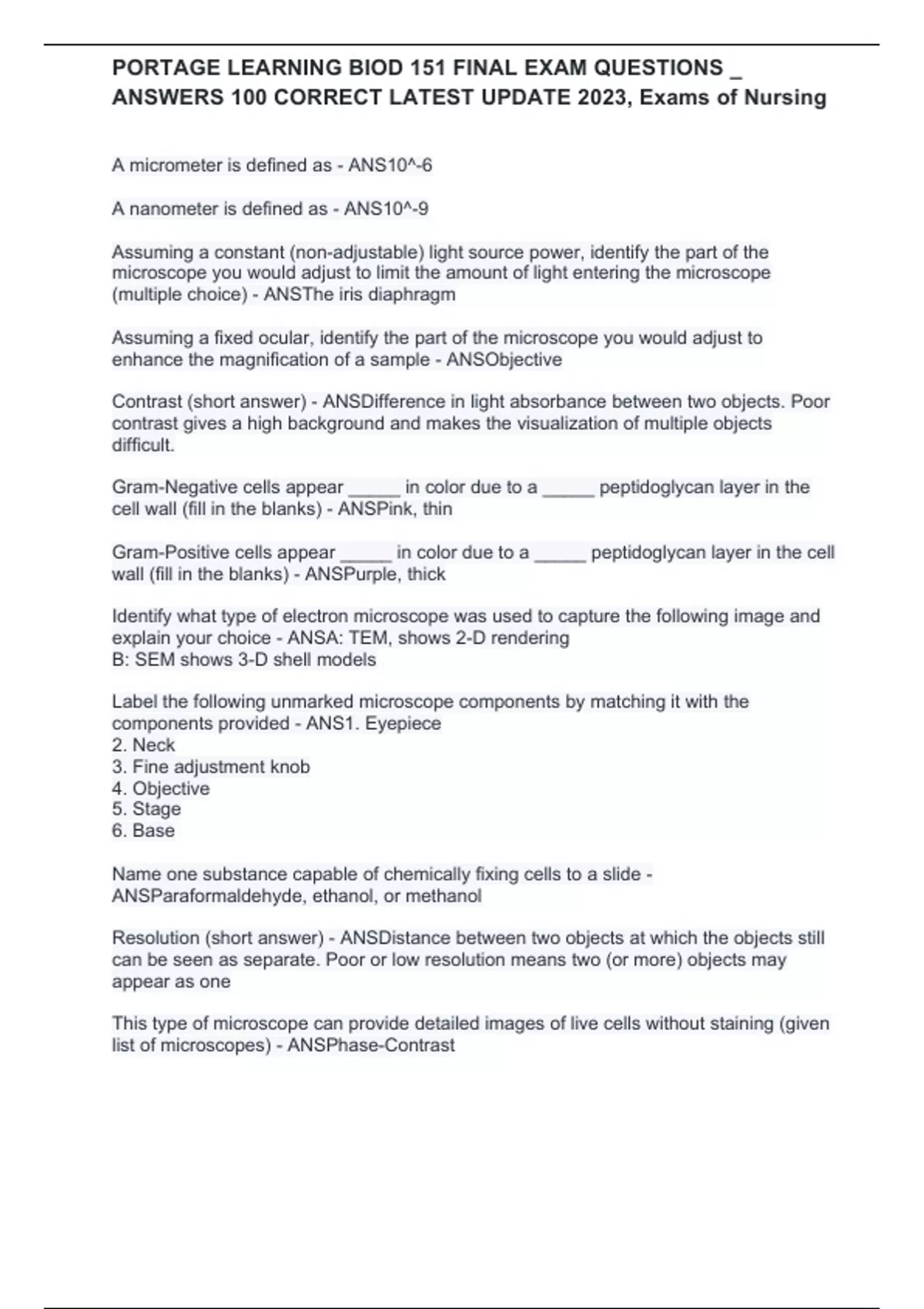 PORTAGE LEARNING BIOD 151 FINAL EXAM QUESTIONS _ ANSWERS 100 CORRECT LATEST UPDATE 2023, Exams of Nursing