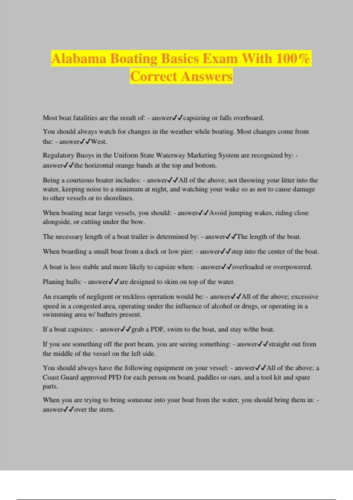 Alabama Boating Basics Exam With 100% Correct Answers Most boat fatalities are the result of: - answercapsizing or falls overboard. You should always watch for changes in the weather while boating. Most changes come from the: - answerWest. Regulatory Buoys in the Uniform State Waterway Marketing System are recognized by: - answerthe horizontal orange bands at the top and bottom. Being a courteous boater includes: - answerAll of the above; not throwing your litter into the water, keeping noise to a minimum at night, and watching your wake so as not to cause damage to other vessels or to shorelines. When boating near large vessels, you should: - answerAvoid jumping wakes, riding close alongside, or cutting under the bow. The necessary length of a boat trailer is determined by: - answerThe length of the boat. When boarding a small boat from a dock or low pier: - answerstep into the center of the boat. A boat is less stable and more likely to capsize when: - answeroverloaded or overpowered. Planing hulls: - answerare designed to skim on top of the water. An example of negligent or reckless operation would be: - answerAll of the above; excessive speed in a congested area, operating under the influence of alcohol or drugs, or operating in a swimming area w/ bathers present. If a boat capsizes: - answergrab a PDF, swim to the boat, and stay w/the boat. If you see something off the port beam, you are seeing something: - answerstraight out from the middle of the vessel on the left side. You should always have the following equipment on your vessel: - answerAll of the above; a Coast Guard approved PFD for each person on board, paddles or oars, and a tool kit and spare parts. When you are trying to bring someone into your boat from the water, you should bring them in: - answerover the stern