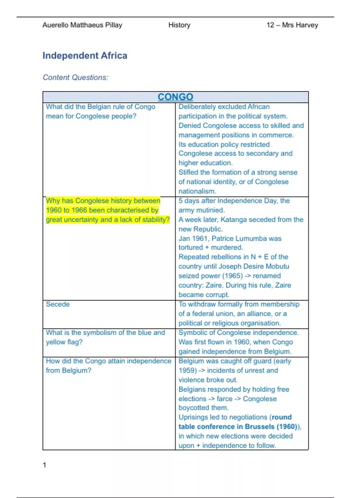 This document entails a thorough selection of questions, concepts and answers on the IEB History Topic: Independent Africa. This includes notes on Congo, Tanzania & Angola. Using these notes, I achieved a Top 5% National ranking in the 2023 final examinations, with a History average of 88%.