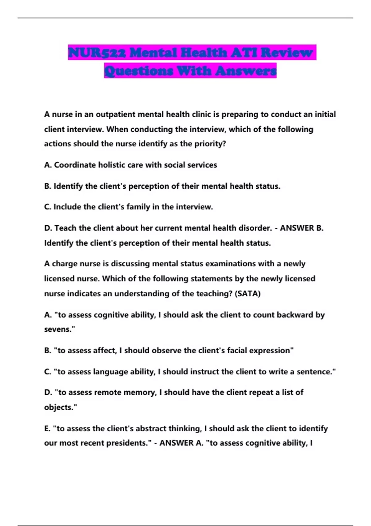 NUR522 Mental Health ATI Review Questions With Answers...