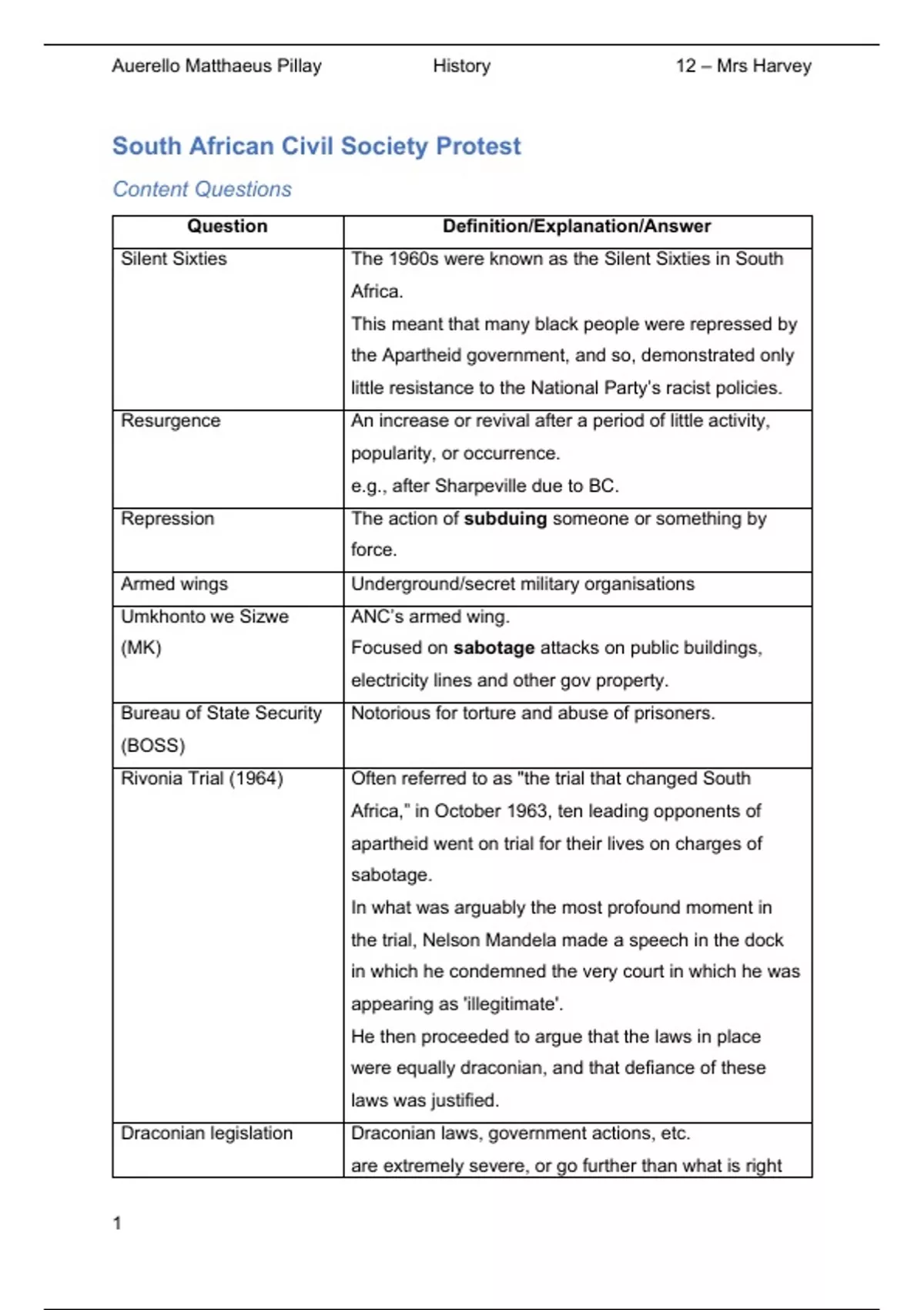 , Auerello Matthaeus Pillay History 12 – Mrs Harvey