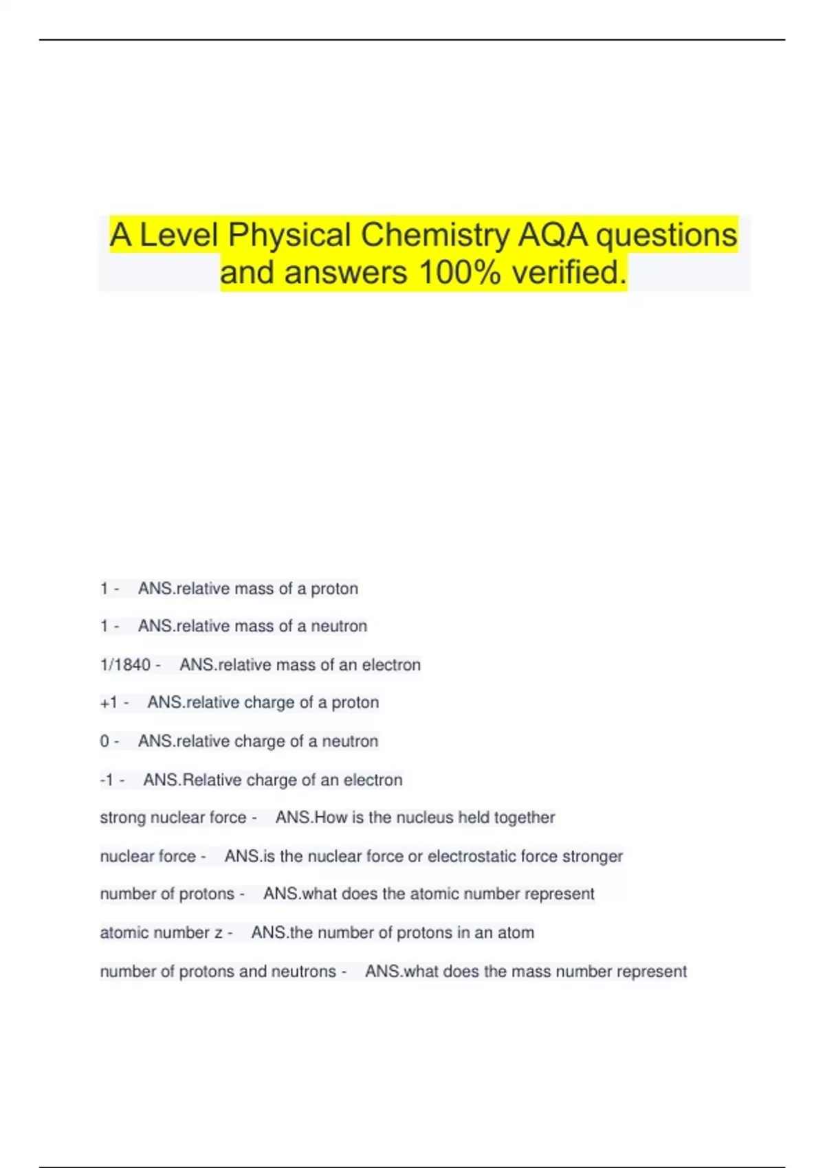 A Level Physical Chemistry AQA questions and answers 100% verified. 1 - ANS.relative mass of a proton 1 - ANS.relative mass of a neutron 1/1840 - ANS.relative mass of an electron +1 - ANS.relative charge of a proton 0 - ANS.relative charge of a neutron -1 - ANS.Relative charge of an electron strong nuclear force - ANS.How is the nucleus held together nuclear force - ANS.is the nuclear force or electrostatic force stronger number of protons - ANS.what does the atomic number represent atomic number z - ANS.the number of protons in an atom number of protons and neutrons - ANS.what does the mass number represent mass number (A) - ANS.the number of nucleons in an atom isotopes - ANS.atoms of the same element that have different numbers of neutrons electrons - ANS.what determines the reactivity of an atom H1/H2/H3 - ANS.hydrogen isotopes Cl35/Cl37 - ANS.Chlorine isotopes Br79/Br81 - ANS.Bromine isotopes C-14 - ANS.Carbon isotope used for carbon dating 2 - ANS.Number of electrons the first shell can hold 8 - ANS.Number of electrons the second shell can hold 18 - ANS.Number of electrons the third shell can hold Relative Atomic Mass - ANS.Ar Relative Atomic Mass - ANS.average mass of 1 atom/1/12 of 1 atom of C-12 determines the mass of separate atoms - ANS.What does the mass spectrometer do? Vacuum - ANS.First step of the TOF Spectrometer Time of Flight Mass spectrometer - ANS.TOF spectrometer full Kept under a high vacuum to avoid collisions with air molecules - ANS.Vacuum step (TOF) Ionisation - ANS.Second step of the TOF spectrometer Dissolved in solvent and passing through needle to a positive terminal with a high voltage producing positively charged droplets which have lost electrons - ANS.First method of ionisation (TOF) Molecules gain a proton - ANS.Second method of ionisation (TOF) Acceleration - ANS.Third step of the TOF spectrometer Positive ions attached to a negative plate so they accelerate towards it, faster depending on their m/z ratio - ANS.Acceleration step (TOF) mass/charge - ANS.m/z ratio Ion Drift - ANS.Fourth step of the TOF spectrometer Ions pass through a hole in the negative plate, forming a beam to travel along the flight tube to the detector - ANS.Ion Drift step (TOF) Detection - ANS.Fifth step of the TOF spectrometer Ions with highest velocities arrive at the detector first and flight times recorded. Ions pick up an electron which causes a current to flow so they are detected - ANS.Detection step (TOF) Data Analaysis - ANS.Sixth step of the TOF spectrometer signal from the detector goes to a computer which generates the mass spectrum - ANS.Data Analysis step (TOF) Identify the abundance of different isotopes - ANS.What can the mass spectrometer do abundance - ANS.what does the height of a peak on a mass spectrum give m/z - ANS.what does the horizontal axis on a mass spectrum give (abundance x m/z) + (abundance x m/z) all over total abundance - ANS.How to work out the Ar of an element from a mass spectrum 2n2 - ANS.General formula for the maximum number of electrons each energy level can hold s,p,d,f - ANS.four different atomic sub-levels s - ANS.Which sub-levels does the first shell contain s,p - ANS.Which sub-levels does the second shell contain s,p,d - ANS.Which sub-levels does the third shell contain 2 - ANS.Number of electrons the s sub-level can hold 6 - ANS.Number of electrons the p sub-level can hold 3 - ANS.Maximum number of p-orbitals per shell 10 - ANS.Number of electrons the d sub-level can hold 5 - ANS.Maximum number of d-orbitals per shell s-orbital - ANS. p-orbital - ANS. Atomic orbital - ANS.A region of space around an atomic nucleus where there is a high probability (95%) of finding an electron cloud of negative charge - ANS.what are electrons if not a solid particle It has a lower energy (fills before the 3d) - ANS.what property does the 4d shell have compared to the 3d and what does this mean opposite spins - ANS.what must two electrons in the same orbital have First rule of allocating electrons to atomic orbitals - ANS.Atomic orbitals of lower energies are filled first (same goes for sub-levels) Second rule of allocating electrons to atomic orbitals - ANS.Atomic orbitals of the same energy fill up singly before pairing starts Electrons repel - ANS.Why do atomic orbitals fill singly before pairing? 2 - ANS.Number of electrons which can fit in any sub-level 1s2 2s1 - ANS.Electronic configuration of lithium (3 electrons) 1s2 2s2 2p6 3s2 3p6 4s2 - ANS.Full electronic configuration of calcium (20 electrons) [Ar]4s2 - ANS.Short electronic configuration of calcium (20 electrons) 1s2 2s2 2p6 3s2 3p6 - ANS.Full electronic configuration of Calcium ion (calcium has 20 electrons) 3d4/3d9 - ANS.Which electronic configurations do not exist for neutral atoms? (d orbital) 1s2 2s2 2p6 3s2 3p6 3d5 4s1 - ANS.Full electronic configuration of chromium 1s2 2s2 2p6 3s2 3p6 3d10 4s1 - ANS.Full electronic configuration of copper The energy required to remove a mole of electrons from a mole of isolated gaseous atoms or ions - ANS.Ionisation Energy (definition)