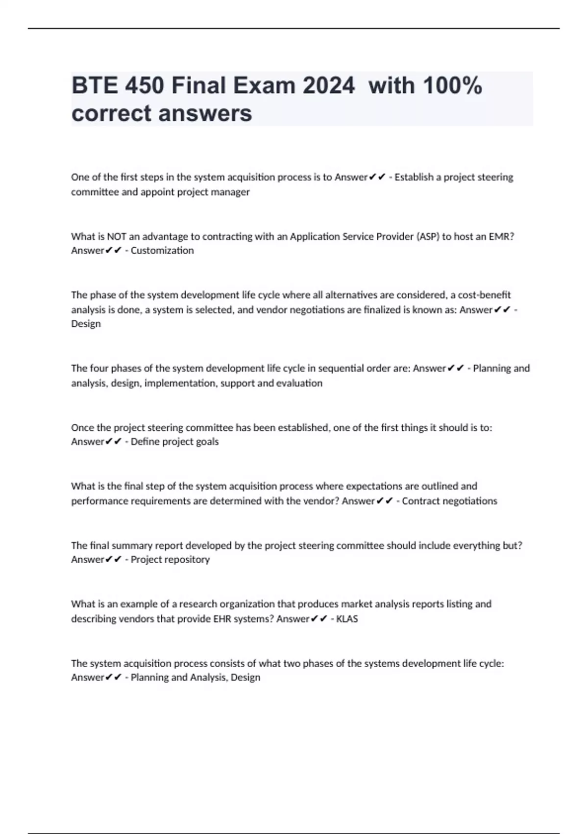 One of the first steps in the system acquisition process is to Answer - Establish a project steering committee and appoint project manager What is NOT an advantage to contracting with an Application Service Provider (ASP) to host an EMR? Answer - Customization The phase of the system development life cycle where all alternatives are considered, a cost-benefit analysis is done, a system is selected, and vendor negotiations are finalized is known as: Answer - Design The four phases of the system development life cycle in sequential order are: Answer - Planning and analysis, design, implementation, support and evaluation Once the project steering committee has been established, one of the first things it should is to: Answer - Define project goals What is the final step of the system acquisition process where expectations are outlined and performance requirements are determined with the vendor? Answer - Contract negotiations The final summary report developed by the project steering committee should include everything but? Answer - Project repository What is an example of a research organization that produces market analysis reports listing and describing vendors that provide EHR systems? Answer - KLAS The system acquisition process consists of what two phases of the systems development life cycle: Answer