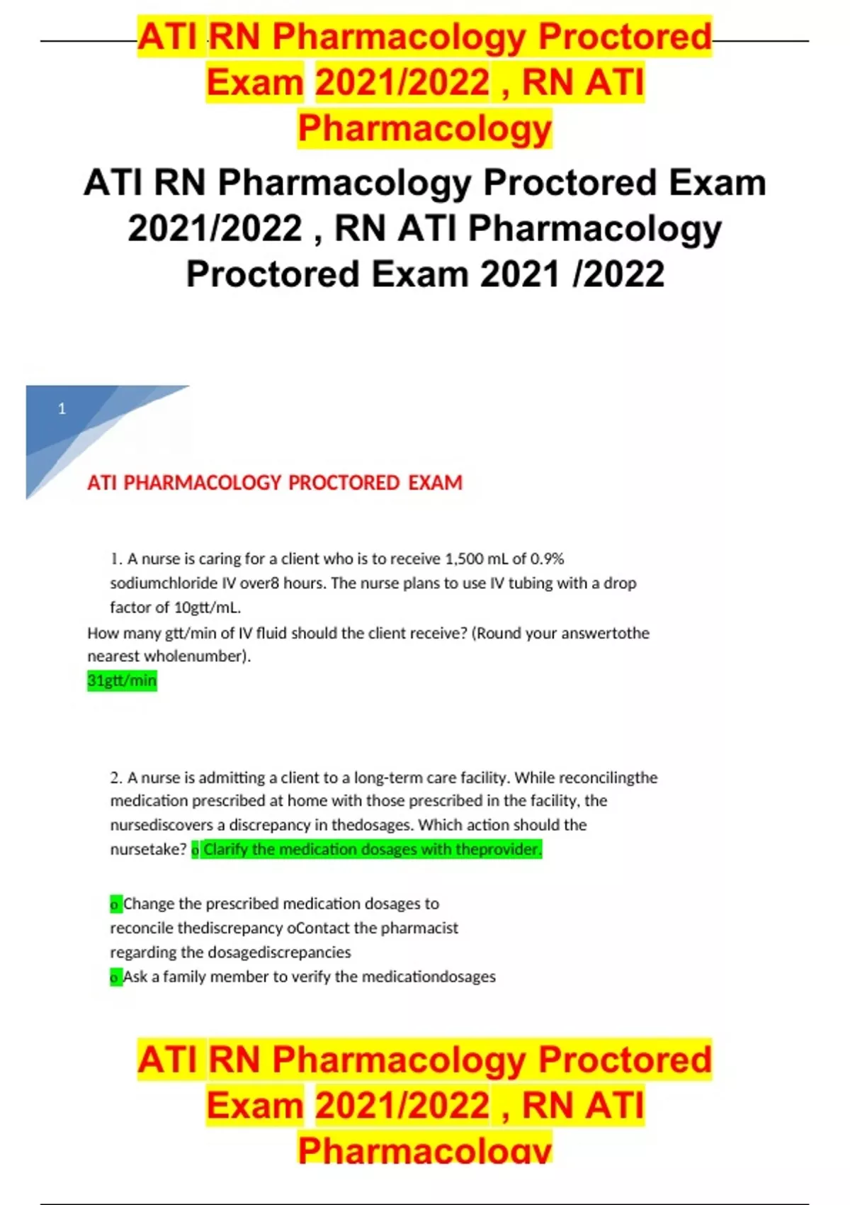 1. A nurse is caring for a client who is to receive 1,500 mL of 0.9% sodiumchloride IV over8 hours. The nurse plans to use IV tubing with a drop factor of 10gtt/mL. How many gtt/min of IV fluid should the client receive? (Round your answertothe nearest wholenumber). 31gtt/min 2. A nurse is admitting a client to a long-term care facility. While reconcilingthe medication prescribed at home with those prescribed in the facility, the nursediscovers a discrepancy in thedosages. Which action should the nursetake? o Clarify the medication dosages with theprovider. o Change the prescribed medication dosages to reconcile thediscrepancy oContact the pharmacist regarding the dosagediscrepancies o Ask a family member to verify the medicationdosages 3. A nurse is caring for a client who is receiving a fentanyl transdermalsystem(Duragesic). What is important to document in the client’srecord? o Fluidintake o Skinintegrity o Respiratoryrate oPulserate ATI RN Pharmacology Proctored Exam 2021/2022 , RN ATI Pharmacology Proctored Exam 2021 /2022 4. A nurse is caring for a client who has acute angina and has a prescription fornitroglycerin. Whichof the following is an appropriate intervention for the nurse totake whenadministering thismedication? o Massage the nitroglycerin ointment completely into theskin. oReplace the nitroglycerin transdermal patch every 4hours. o Administer a sustained nitroglycerin tabletorally. o Administer a nitroglycerin tablet sublingually every 5minutes. 5. A nurse is assessing a school age client who is experiencing seizure activity and isprescribed diazepam (Valium) IV. The nurse should should clarify the order if the client is receivinga continuousinfusion of which of the followingIV: o Lactated Ringerssolution o 0.9% Sodium chloride with 100 units of regularinsulin o0.9% sodiumchloride o 0.9% Sodium chloride with 20 mEq of potassiumchloride o A nurse is providing discharge dietary teaching to a client who has a something and is taking medicationtheophylline and to provide general instructions the nurse should include? Avoid caffeinated beverages 2. the nurse is mixing regular insulin and NPH into a syringe for a client who has diabetes mellitus. Whichof the following actions should the nurse take first? Inject air into the NPH vial 3. a nurse is teaching a client who has a new prescription of Alendronate for osteoporosis. Whatinstructions should the nurse include? Sit upright for at least 30 mins after taking the medication 4. a nurse is caring for a client who is postoperative following a thyroidectomy and is receiving morphinefor pain. Which of the following findings should the nurse recognize as an adverse effect of morphine? Bladder distention 5. nurse is teaching a client who has pernicious anemia to self-administer cyanocobalamin. Which of thefollowing information should the nurse include in the teaching? Administer the medication into one nostril once per week 6. a nurse is teaching a newly license nurse about medication reconciliation. The nurse should instructthe newly license nurse for medication reconciliation for which of the following clients? A client who has been transferred to a step-down unit 7. a nurse is assessing a client how received a dinoprostone gel to stimulate the cervical ripening. Whichof the following is the nurses priority? Uterine tachysystole 8. a nurse is performing a return demonstration of an enoxaparin administration. Which of the followingclient actions indicates an understanding of the teaching?Administers the medication into the abdomen 9. a nurse is assessing a client how has been taking digoxin and …… which of the following findings to thenurse indicates this client has developed digoxin toxicity?Blurred vision ATI PHARMACOLOGY PROCTORED EXAM 10. a nurse is caring for a client who received neostigmine 1 hour ago and is experiencing muscarinicresponse. Which if the following manifestations should the nurse expect?Excessive salivation 6. A nurse is assessing a client who is taking enalapril (Vasotec) for congestive heartfailure. Whichof the following indicates an expectedfinding? o Activitytolerance o Orthostatichypoten sion oLoss of strength o Increase in bloodpressure 7. A child with cerebral palsy is prescribed Baclofen (Lioresol). Which of thefollowingtherapeutic effects should the nursemonitor? o Increased urineoutput o Increasedenergy o Decreased anxiety o Decreased spacity 8. A nurse is assessing a school age client who is experiencing seizure activity and isprescribed diazepam (Valium) IV. The nurse should should clarify the order if the client is receivinga continuousinfusion of which of the followingIV: o Lactated Ringerssolution o 0.9% Sodium chloride with 100 units of regularinsulin o0.9% sodiumchloride o 0.9% Sodium chloride with 20 mEq of potassiumchloride A nurse is providing teaching to a client who has gout and a new prescriptionfor allopurinol. The nurse should instruct the client to discontinue taking the medication for ATI PHARMACOLOGY PROCTORED EXAM which of the following adverse effects? 1. Nausea 2. Metallic taste 3. Fever 4. Drowsiness A nurse is providing teaching to a client who has ulcerative colitis and a new prescription for sulfasalazine. The nurse should instruct the client to monitorfor which of the following adverse effects of this medication? 1. Jaundice 2. Constipation 3. Oral candidiasis 4. Sedation a nurse is providing teaching to a client who has rhematoid arthritis and a prescription for long term prednisone therapy. the nurse should instruct theclient to monitor for which of the following adverse effects? 1. Stress fractures