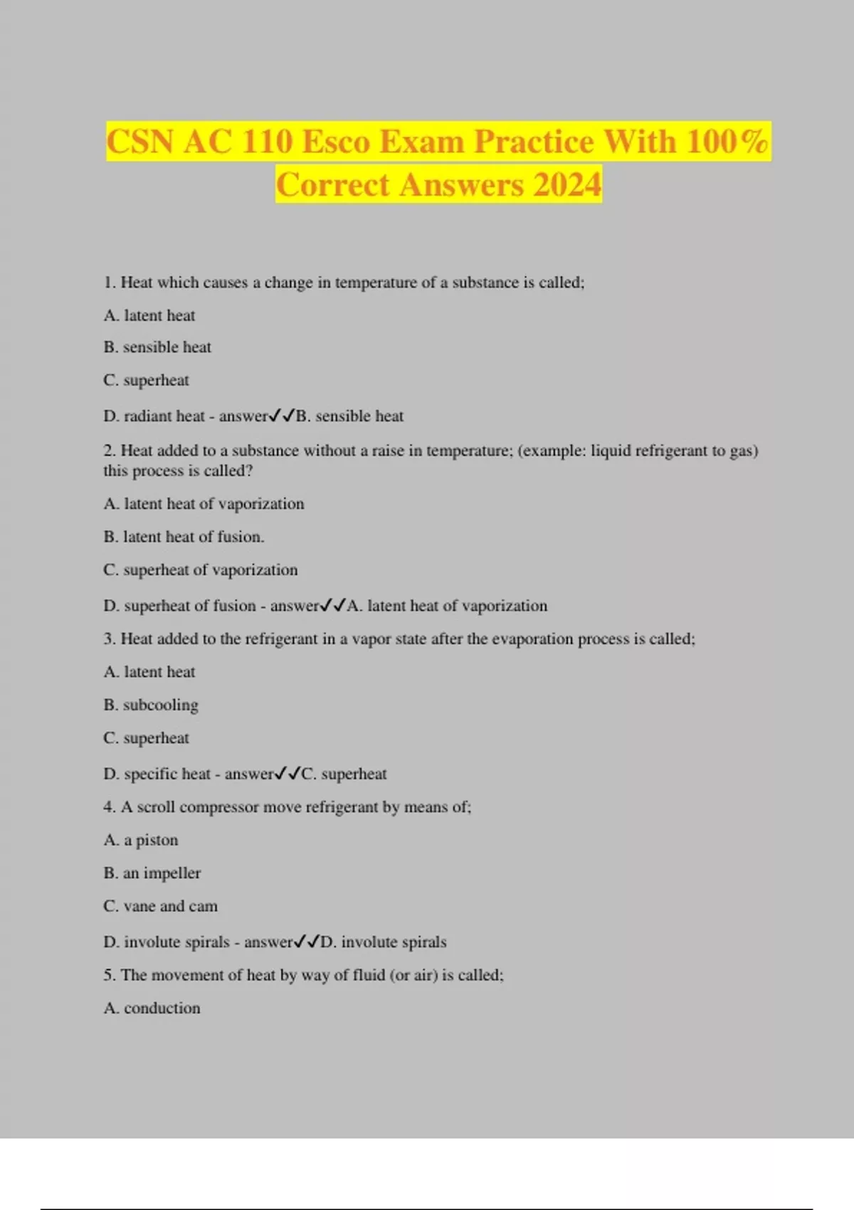 CSN AC 110 Esco Exam Practice With 100% Correct Answers 2024 1. Heat which causes a change in temperature of a substance is called; A. latent heat B. sensible heat C. superheat D. radiant heat - answerB. sensible heat 2. Heat added to a substance without a raise in temperature; (example: liquid refrigerant to gas) this process is called? A. latent heat of vaporization B. latent heat of fusion. C. superheat of vaporization D. superheat of fusion - answerA. latent heat of vaporization 3. Heat added to the refrigerant in a vapor state after the evaporation process is called; A. latent heat B. subcooling C. superheat D. specific heat - answerC. superheat 4. A scroll compressor move refrigerant by means of; A. a piston B. an impeller C. vane and cam D. involute spirals - answerD. involute spirals 5. The movement of heat by way of fluid (or air) is called; A. conduction B. convection C. radiation D. percussion - answerB. convection 6. The movement of heat through a solid object is called; A. conduction B. convection C. radiation D. compression - answerA. conduction 7. The standard unit for measuring the quantity of heat in a substance is; A. degrees Fahrenheit B. degrees Celsius C. degrees Rankin D. the British Thermal Unit (Btu) - answerD. the British Thermal Unit (Btu) 8. A refrigerant gives up heat when; A. it condenses B. it evaporates C. it is compressed D. it vaporizes - answerA. it condenses 9. Why must refrigerant in the suction line be slightly warmer than the saturation temperature? A. prevent liquid slugging of hte compressor B. prevent refrigerant vapor lock C. prevent the compressor from overheating D. prevent oil miscibility - answerA. prevent liquid slugging of the compressor 10. The state of the refrigerant in the suction line should be; A. high pressure / high temperature liquid B high pressure / low temperature vapor C. low pressure / low temperature liquid D. low pressure / low temperature vapor - answerD. low pressure / low temperature vapor 11. The state of the refrigerant entering the condenser is; A. high temperature / highly superheated liquid B. high pressure / highly superheated vapor C. high pressure / high temperature liquid D. low pressure / low temperature vapor - answerB. high pressure / highly superheated vapor 12. the evapora