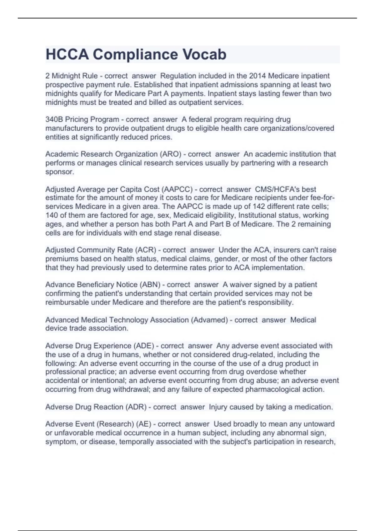 HCCA CHC Board Certification Exam Questions and Answers 2023/2024 2 Midnight Rule - correct answer Regulation included in the 2014 Medicare inpatient prospective payment rule. Established that inpatient admissions spanning at least two midnights qualify for Medicare Part A payments. Inpatient stays lasting fewer than two midnights must be treated and billed as outpatient services. 340B Pricing Program - correct answer A federal program requiring drug manufacturers to provide outpatient drugs to eligible health care organizations/covered entities at significantly reduced prices. Academic Research Organization (ARO) - correct answer An academic institution that performs or manages clinical research services usually by partnering with a research sponsor. Adjusted Average per Capita Cost (AAPCC) - correct answer CMS/HCFA's best estimate for the amount of money it costs to care for Medicare recipients under fee-for-services Medicare in a given area. The AAPCC is made up of 142 different rate cells; 140 of them are factored for age, sex, Medicaid eligibility, Institutional status, working ages, and whether a person has both Part A and Part B of Medicare. The 2 remaining cells are for individuals with end stage renal disease. Adjusted Community Rate (ACR) - correct answer Under the ACA, insurers can't raise premiums based on health status, medical claims, gender, or most of the other factors that they had previously used to determine rates prior to ACA implementation. Advance Beneficiary Notice (ABN) - correct answer A waiver signed by a patient confirming the patient's understanding that certain provided services may not be reimbursable under Medicare and therefore are the patient's responsibility. Advanced Medical Technology Association (Advamed) - correct answer Medical device trade association. Adverse Drug Experience (ADE) - correct answer Any adverse event associated with the use of a drug in humans, whether or not considered drug-related, including the following: An adverse event occurring in the course of the use of a drug product in professional practice; an adverse event occurring from drug overdose whether accidental or intentional; an adverse event occurring from drug abuse; an adverse event occurring from drug withdrawal; and any failure of expected pharmacological action. Adverse Drug Reaction (ADR) - correct answer Injury caused by taking a medication. Adverse Event (Research) (AE) - correct answer Used broadly to mean any untoward or unfavorable medical occurrence in a human subject, including any abnormal sign, symptom, or disease, temporally associated with the subject's participation in research, whether or not considered related to the subject's participation in the research. Adverse events encompass both physical and psychological harms. Affiliated Covered Entity (ACE) - correct answer Under HIPAA, legally separate covered entities under common ownership or control have an option to be treated as a single legal entity by choosing to designate as ACE. This enables the entities to share information in a way that would otherwise be impermissible (use vs. disclosure). Agency for Healthcare Research and Quality (AHRQ) - correct answer Agency within the Department of Health and Human Services, whose mission is to produce evidence to make health care safer, higher quality, more accessible, equitable, and affordable, and to work within HHS and other partners to make sure that the evidence is understood and used. Ambulatory Care Center (ACC) - correct answer Medical provide with services aimed at one-day surgical patients and non-surgical outpatients. Patients treated in ACCs include pediatric, adolescent, adult and geriatric.