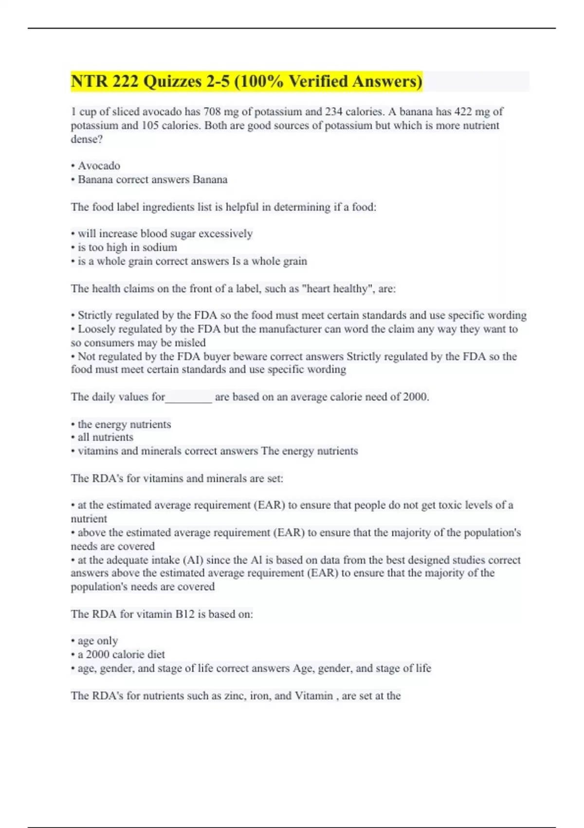1 cup of sliced avocado has 708 mg of potassium and 234 calories. A banana has 422 mg of potassium and 105 calories. Both are good sources of potassium but which is more nutrient dense? • Avocado • Banana correct answers Banana The food label ingredients list is helpful in determining if a food: • will increase blood sugar excessively • is too high in sodium • is a whole grain correct answers Is a whole grain The health claims on the front of a label, such as "heart healthy", are: • Strictly regulated by the FDA so the food must meet certain standards and use specific wording • Loosely regulated by the FDA but the manufacturer can word the claim any way they want to so consumers may be misled • Not regulated by the FDA buyer beware correct answers Strictly regulated by the FDA so the food must meet certain standards and use specific wording The daily values for________ are based on an average calorie need of 2000. • the energy nutrients • all nutrients • vitamins and minerals correct answers The energy nutrients The RDA's for vitamins and minerals are set: • at the estimated average requirement (EAR) to ensure that people do not get toxic levels of a nutrient • above the estimated average requirement (EAR) to ensure that the majority of the population's needs are covered • at the adequate intake (AI) since the Al is based on data from the best designed studies correct answers above the estimated average requirement (EAR) to ensure that the majority of the population's needs are covered The RDA for vitamin B12 is based on: • age only • a 2000 calorie diet • age, gender, and stage of life correct answers Age, gender, and stage of life The RDA's for nutrients such as zinc, iron, and Vitamin , are set at the